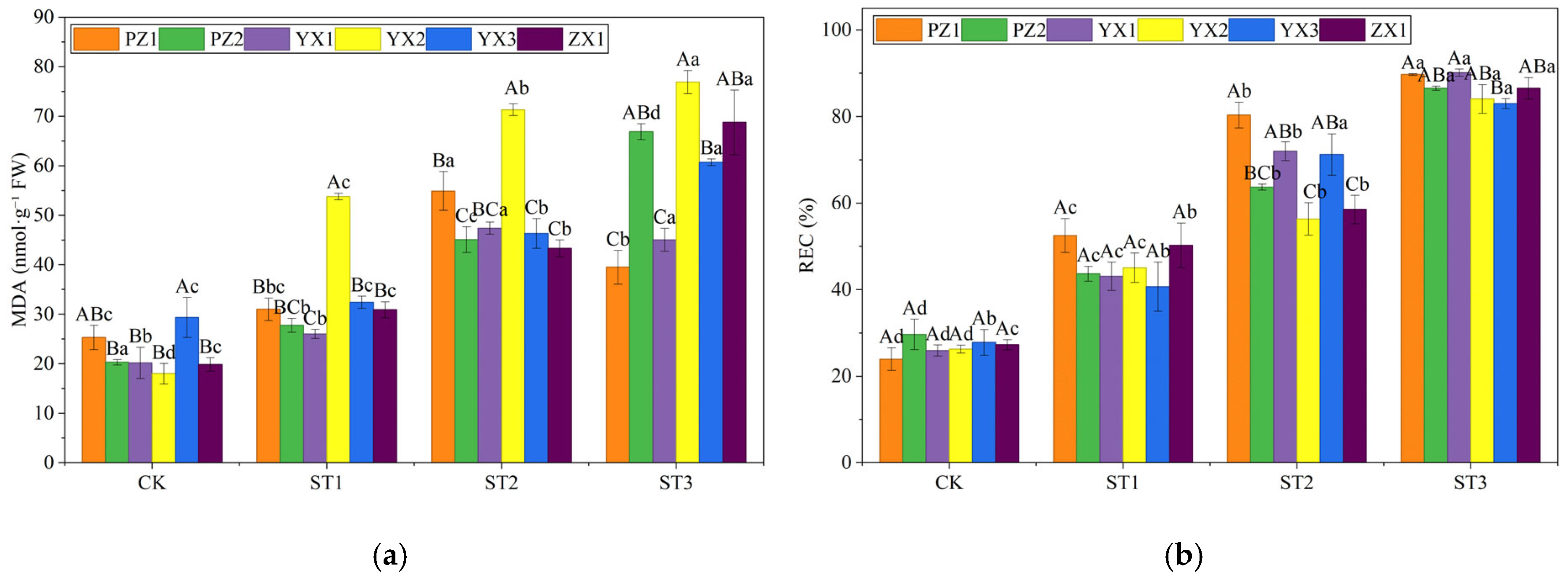 2.1. Changes in MDA and REC Content in Different Poplar Varieties Under Salt Stress