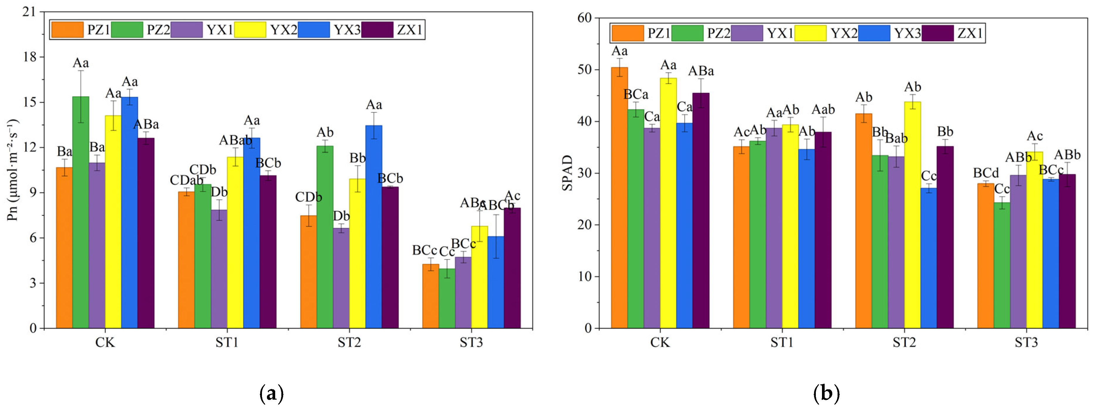 2.2. Changes in Pn and SPAD in Different Poplar Varieties Under Salt Stress