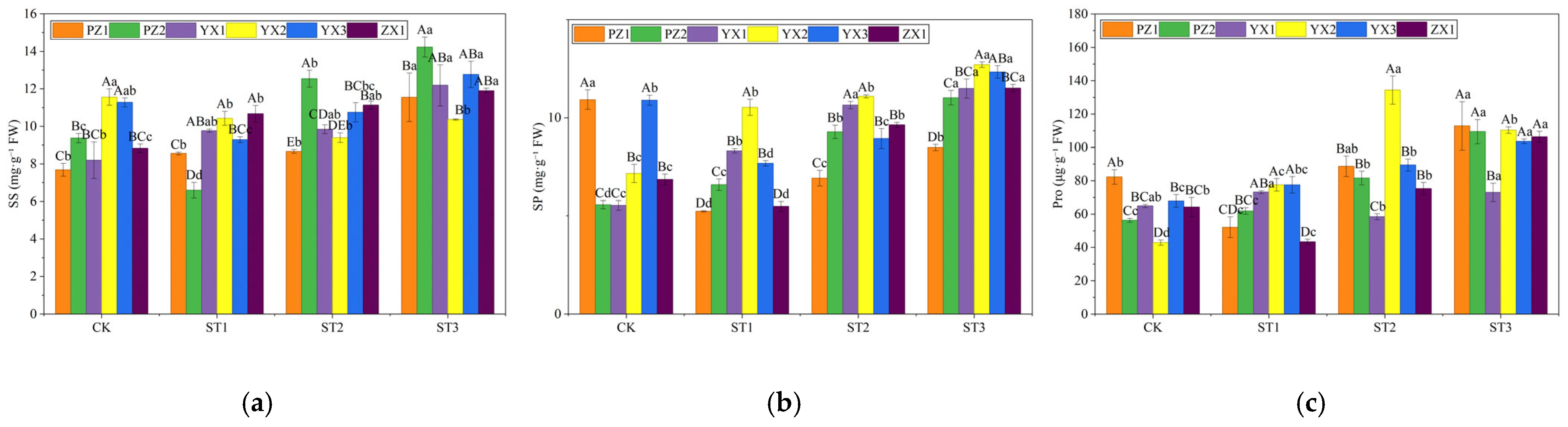 3.2. Effects of Salt Stress on Osmolyte Accumulation in Poplar