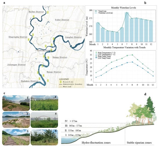 Our study site is located in the central urban area of Chongqing, a typical mountainous city in southwestern China (106°14′36″–106°59′53″ E, 29°7′44″–30°11′21″ N), characterized by a subtropical humid monsoon climate with hot summers, mild winters, and overlapping rainy and hot seasons. The area has abundant water resources, with an annual average temperature of 18.9 °C and precipitation of 1083.0 mm. The Yangtze and Jialing Rivers flow westward through the study area, shaping a polycentric urban development pattern across a total area of 4779 km2, with a population of 7.4 million and an urbanization rate of 93.3% []. The waterfront wilderness in Chongqing’s central urban area exhibits unique regional features, influenced by the flood storage operations of the Three Gorges Reservoir, which cause significant water-level fluctuations and drive periodic dynamic changes in riparian wilderness communities, forming flood- and erosion-resistant wetland herbaceous or shrub-herbaceous communities (Figure 1).