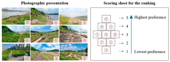 The first survey (N = 260) assessed preferences for six indicators: habitat type, topographic features, naturalness, accessibility, openness, and vegetation structure, selected based on prior research in urban wilderness perception [,,]. These indicators were justified as they capture key spatial and vegetative elements influencing preferences in dynamic waterfront environments []. Three photos per indicator were used to reduce error. Photos were printed on A4 sheets or presented via PowerPoint on a computer, with participants ranking them by personal preference and recording serial numbers on a scoring sheet featuring five tiers (1 = lowest preference to 5 = highest preference, Figure 2).