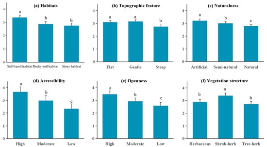 Preference scores for waterfront wilderness landscape in Chongqing’s central urban area. Subfigures represent: (a) Habitat types; (b) Topographic features; (c) Naturalness levels; (d) Accessibility levels; (e) Openness levels; (f) Vegetation structures. Bars indicate mean preference scores. Different lowercase letters (a, b, c) above bars denote significant differences between groups within each subfigure, determined by one-way ANOVA followed by Tukey’s honestly significant difference (HSD) post hoc test at p < 0.05. Error bars represent standard error of the mean (SEM).