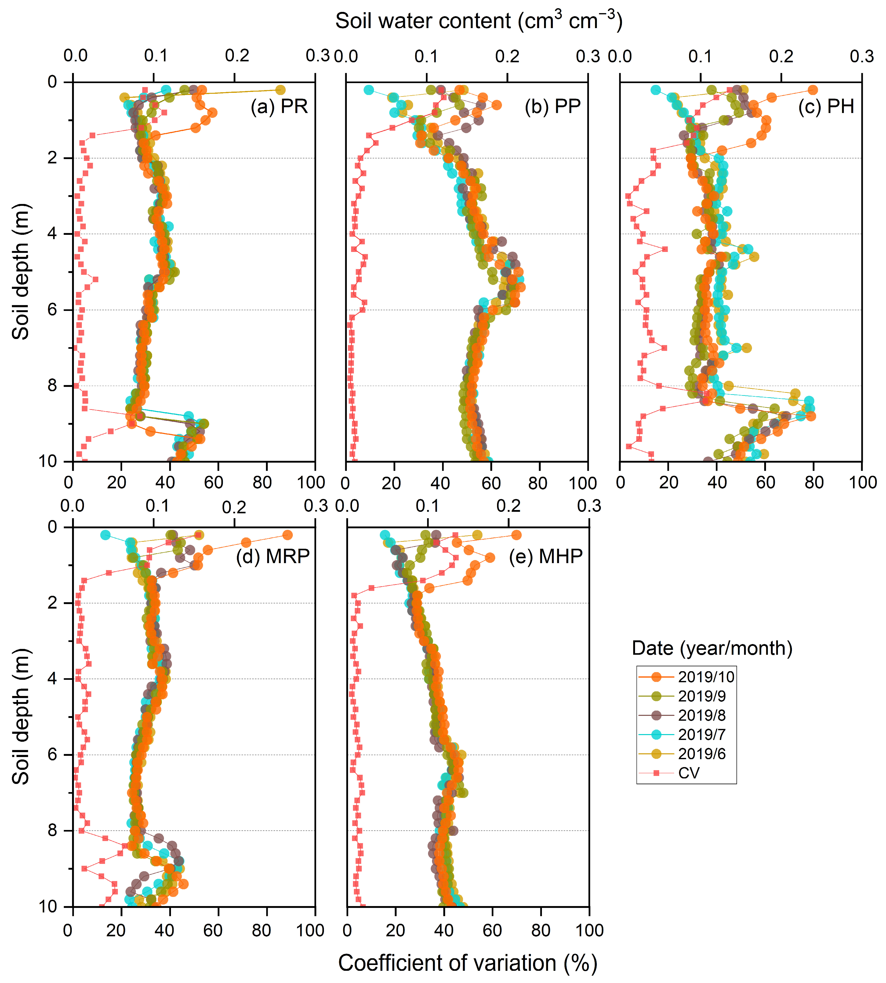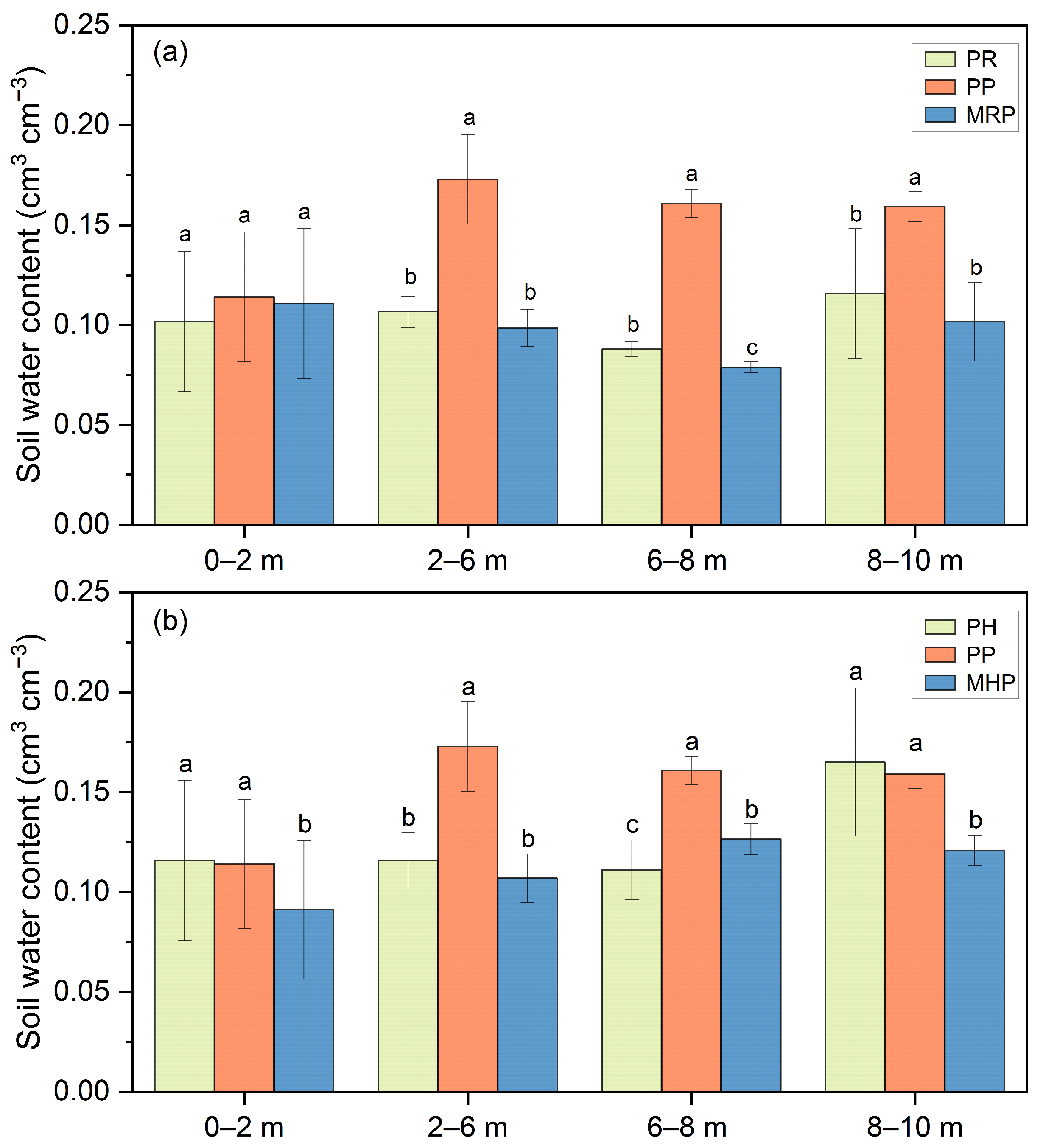 4.1. Effect of Mixed-Species Afforestation on Soil Water Content