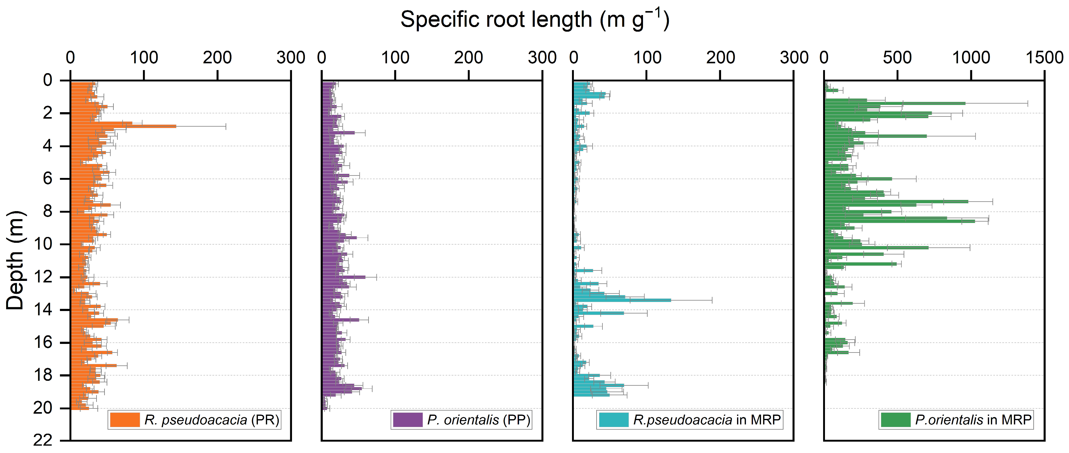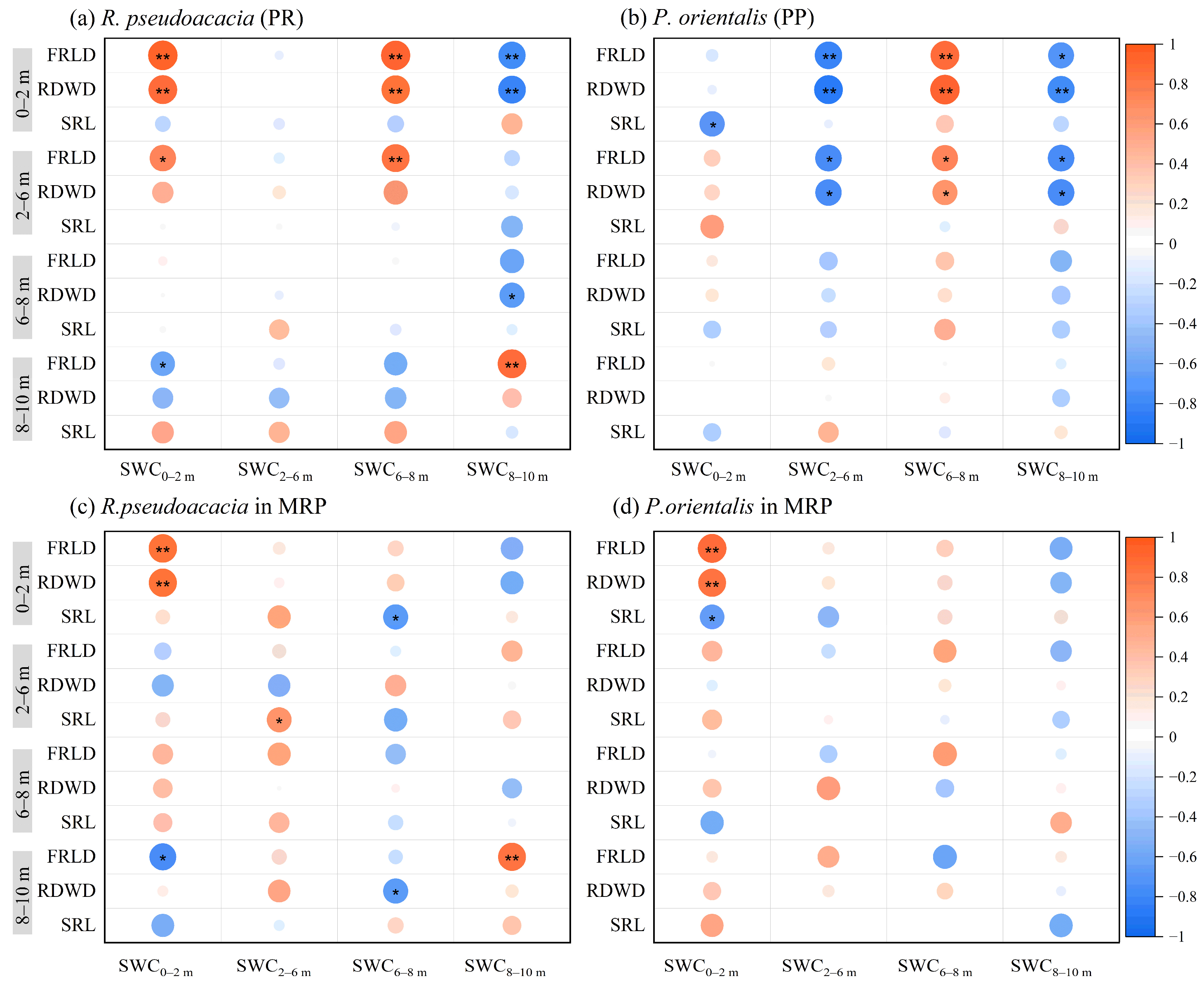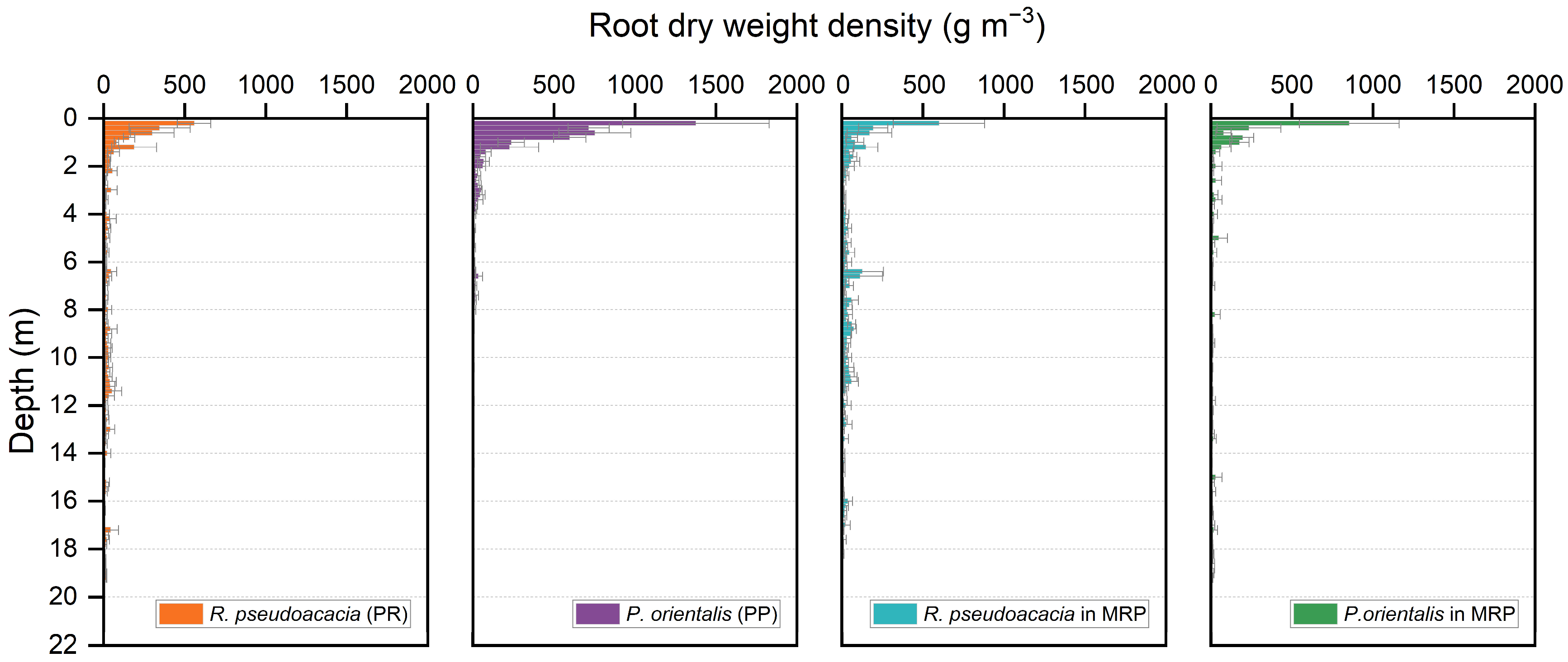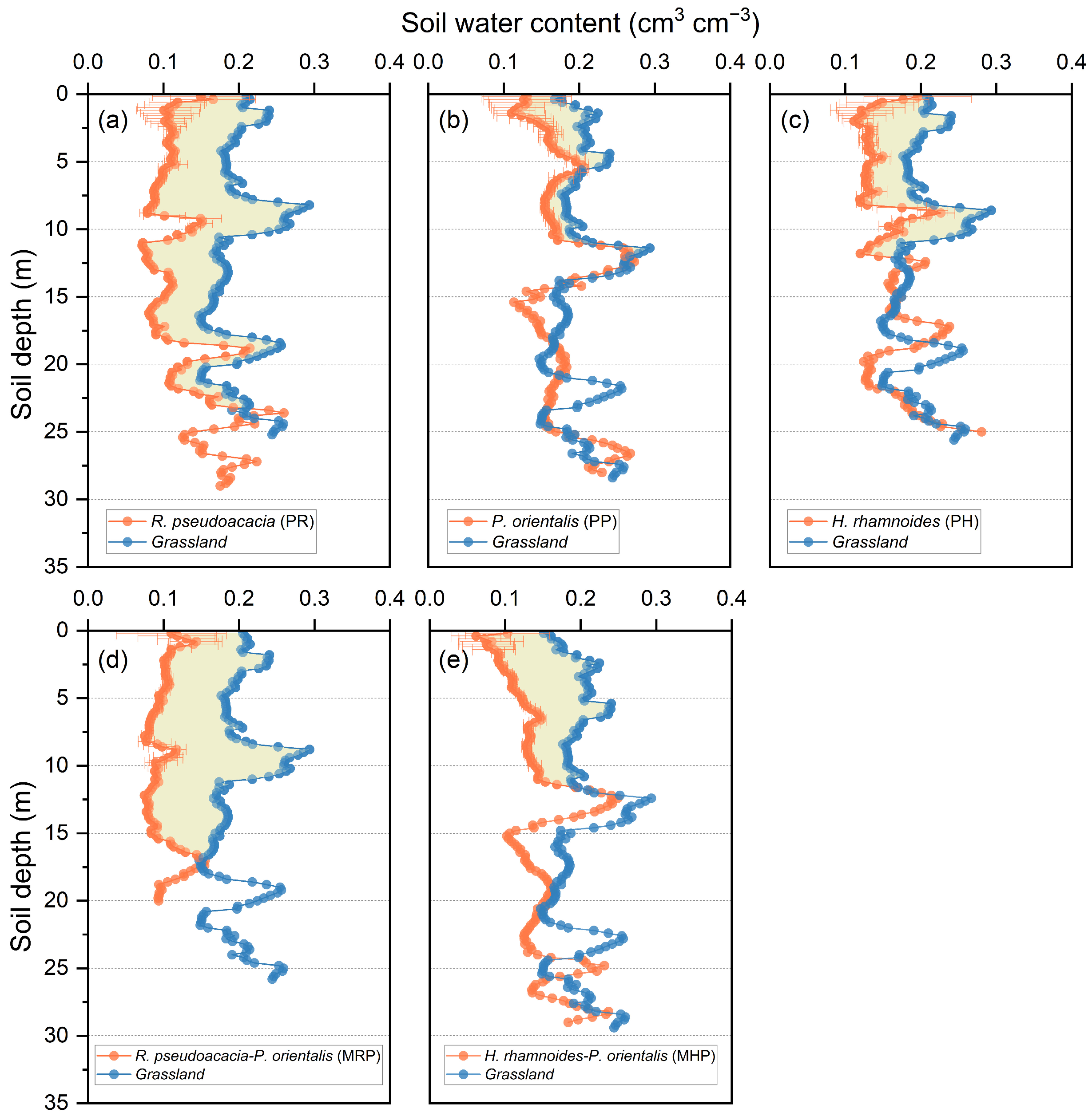 - Wang, S.F.; Yang, M.; Gao, X.D.; Zhang, Z.B.; Wang, X.Z.; Zhao, X.N.; Wu, P.T. Comparison of the root–soil water relationship of two typical revegetation species along a precipitation gradient on the Loess Plateau. Environ. Res. Lett. 2021, 16, 064054. [Google Scholar] [CrossRef]