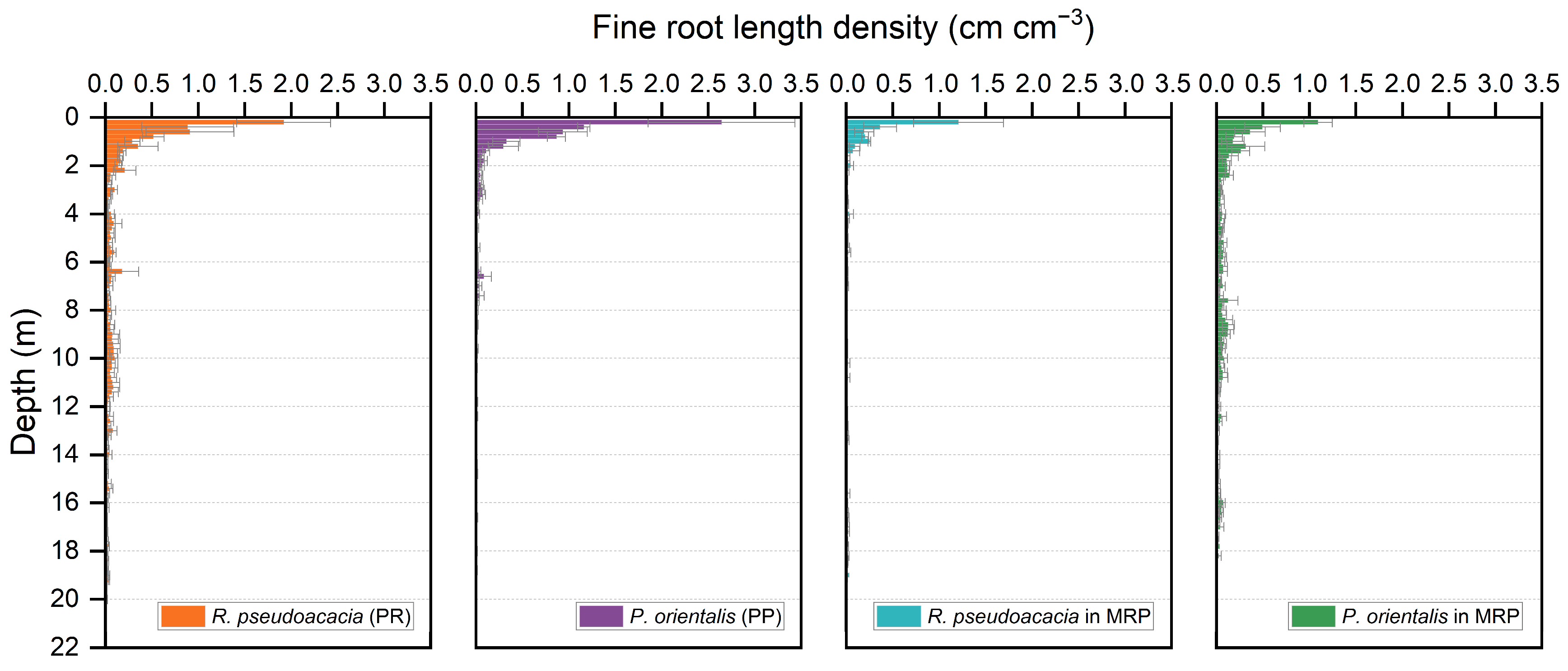 - Zou, S.Y.; Li, D.D.; Di, N.; Liu, J.Q.; Li, L.Y.; Liu, Y.; Xi, B.Y.; Coleman, M. Stand development modifies effects of soil water availability on poplar fine-root traits: Evidence from a six-year experiment. Plant Soil 2022, 480, 165–184. [Google Scholar] [CrossRef]