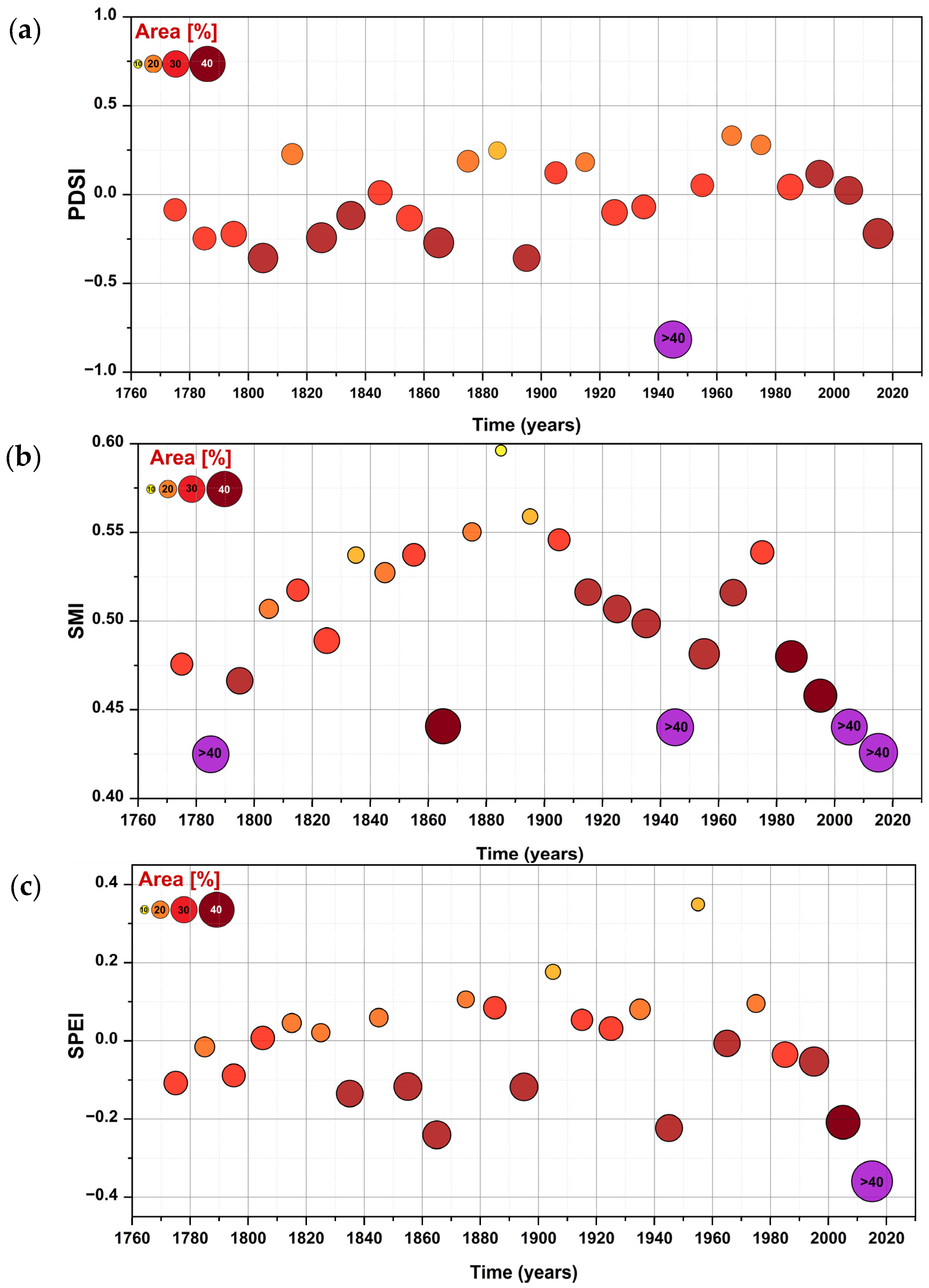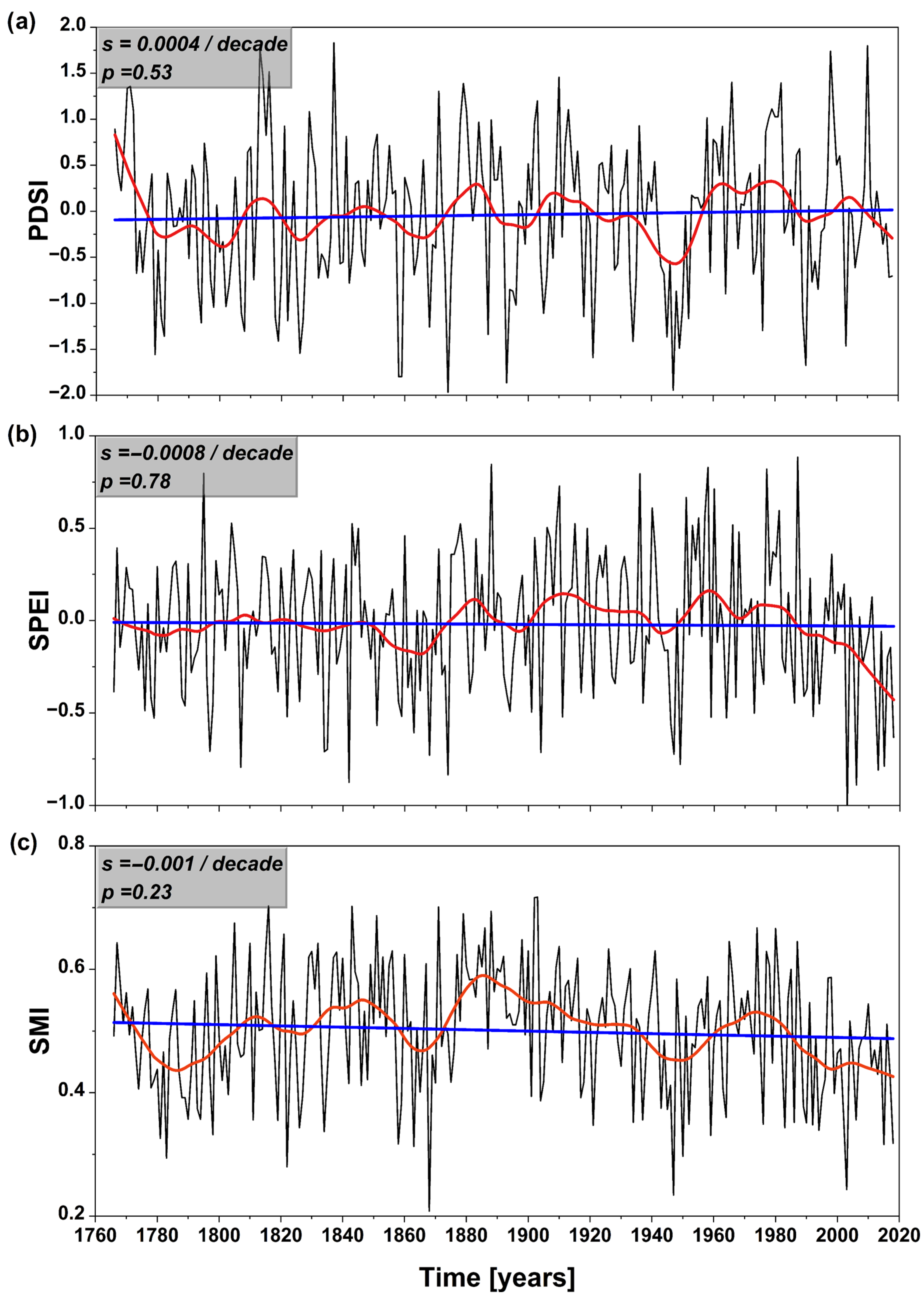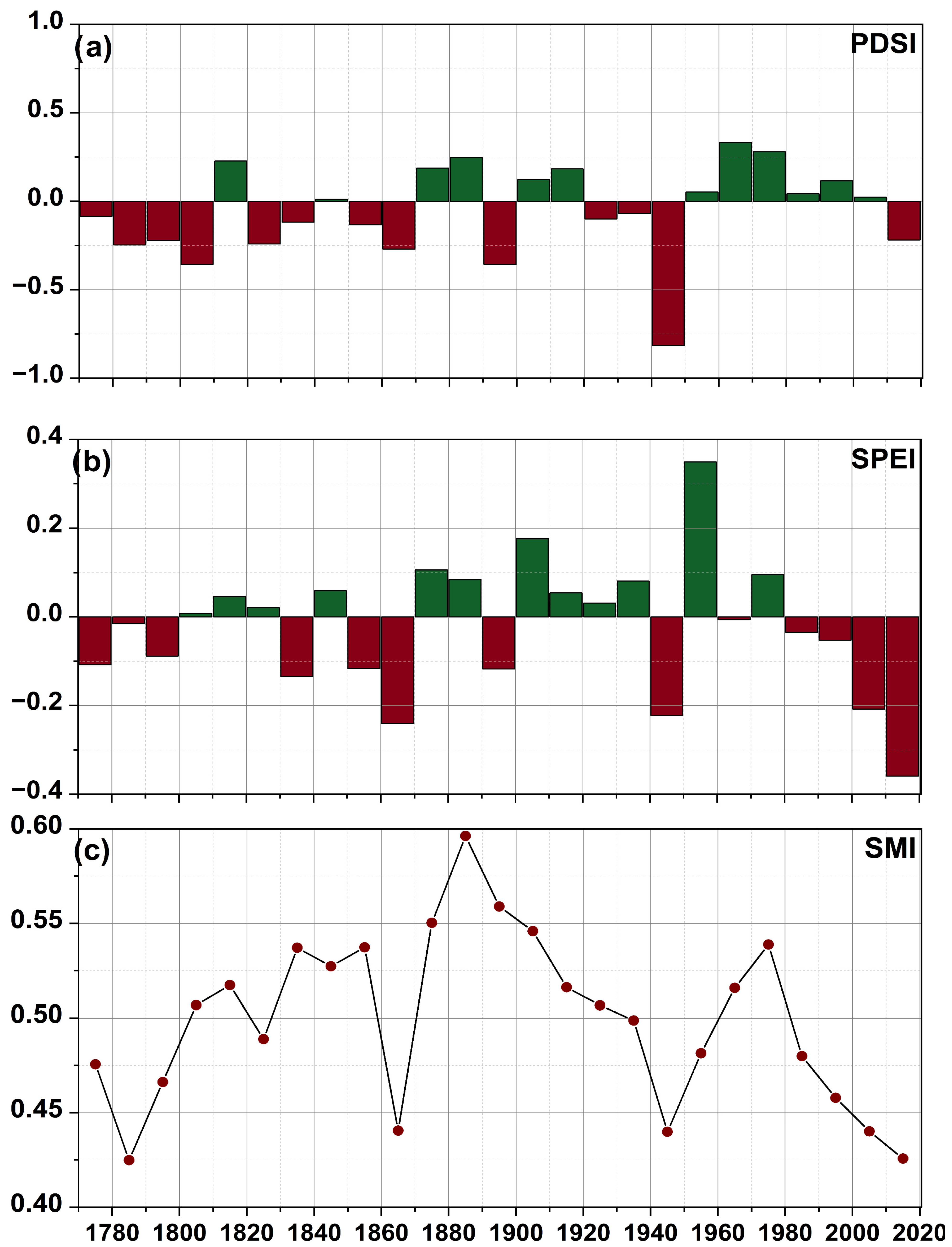 | SPEI | −0.64 | −0.68 | −0.81 | −0.59 | 1766–2018 |