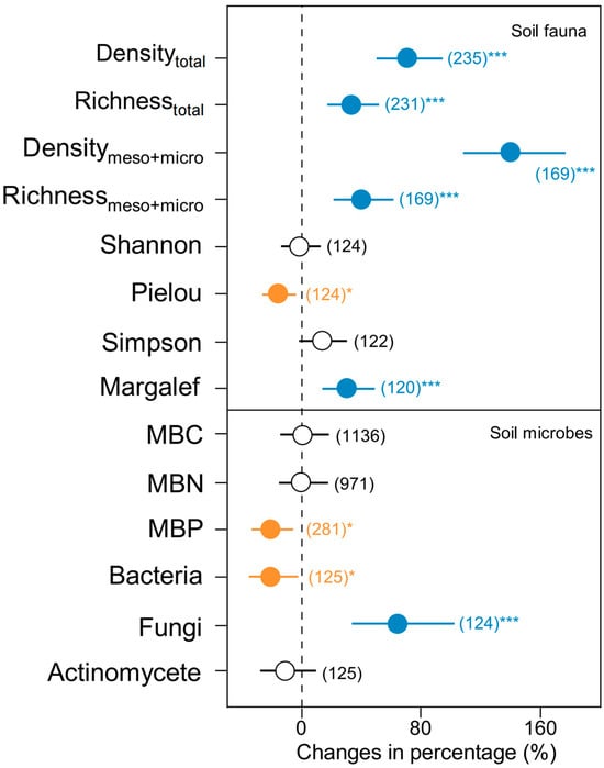 Overall effects of forest canopy opening on soil biota. Values are means ±95% confidence intervals; number of paired observations is shown in parentheses; blue and orange represent positive and negative effects, respectively, at * p < 0.05, *** p < 0.001. The units of microbial biomass carbon, nitrogen, and phosphorus are expressed as concentrations. Bacteria: Bacteria abundance; Fungi: Fungi abundance; Actinomycete: Actinomycete abundance.