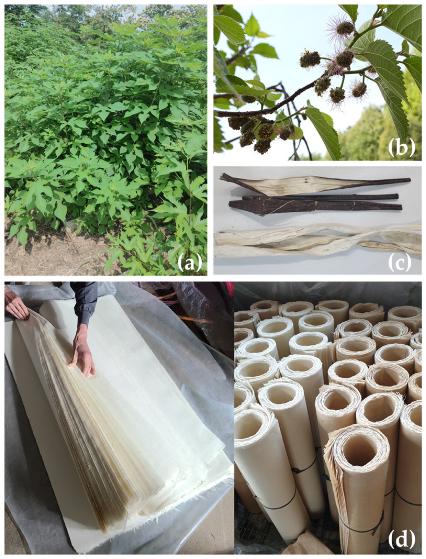 - Kang, H.M.; Koroki, K. A study on the cultivation and production of Korean paper Mulberries and Korean paper manufactures. J. Fac. Agric. Kyushu Univ. 2008, 53, 291–297. [Google Scholar] [CrossRef]