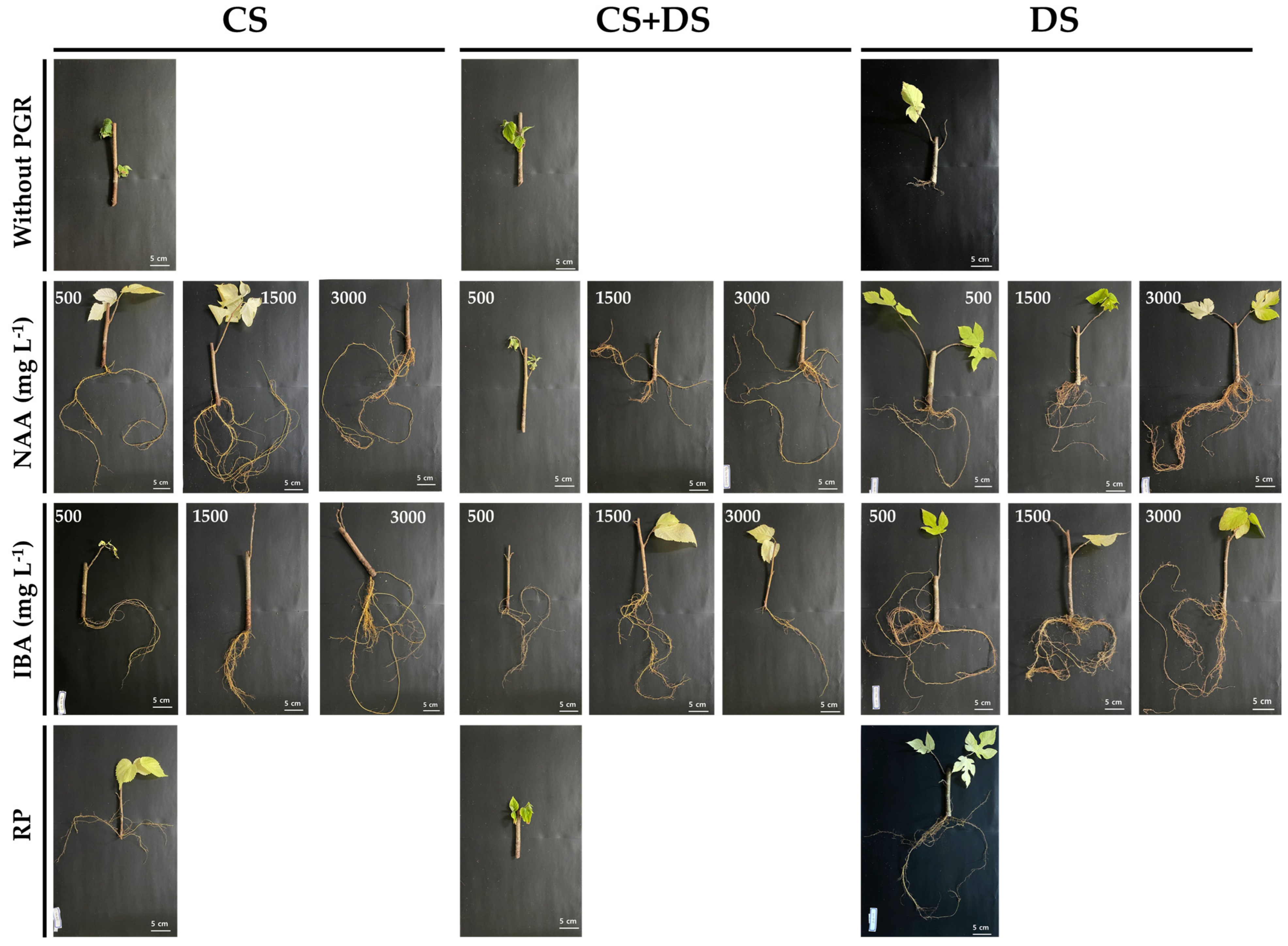 - Campbell, S.M.; Anderson, S.L.; Brym, Z.T.; Pearson, B.J. Evaluation of substrate composition and exogenous hormone application on vegetative propagule rooting success of essential oil hemp (Cannabis sativa L.). PLoS ONE 2021, 16, e0249160. [Google Scholar] [CrossRef] [PubMed]
