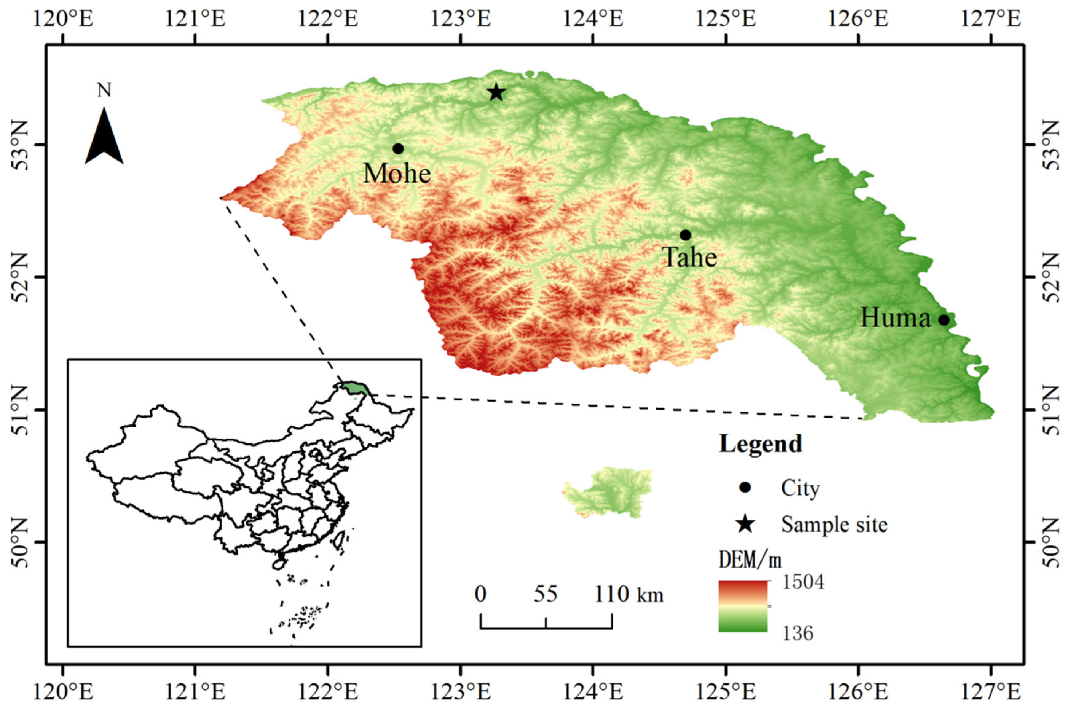 - Jiang, Y.; Wang, Y.; Zhang, J.; Han, S.; Coombs, C.E.O.; Escobedo, M.; Wang, J.; Wang, X.; Hao, L.; Li, G.; et al. Tree-ring reconstruction of June-July mean temperatures in the northern Daxing’an Mountains, China. Geochronometria 2020, 47, 13–22. [Google Scholar] [CrossRef]
