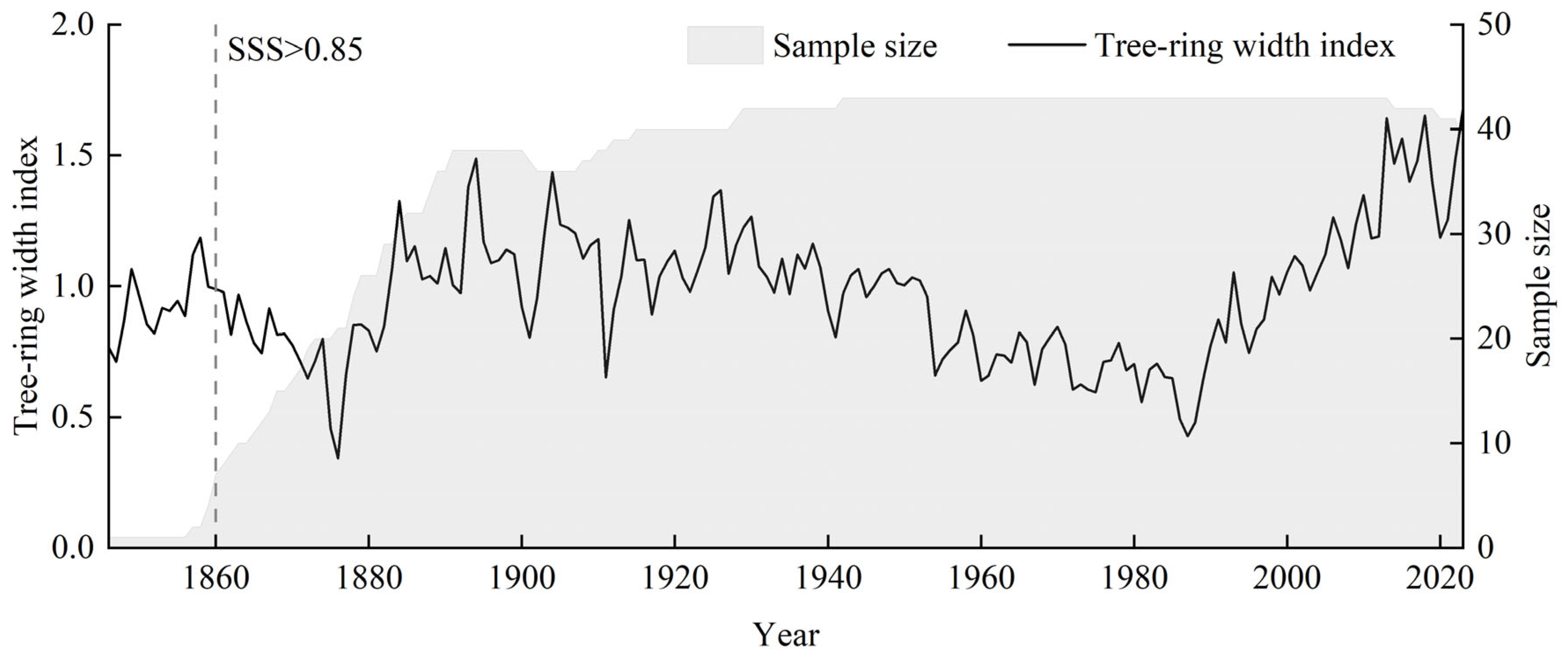 - Fan, Y.; Shang, H.; Wu, Y.; Li, Q. Tree-Ring Width and Carbon Isotope Chronologies Track Temperature, Humidity, and Baseflow in the Tianshan Mountains, Central Asia. Forests 2020, 11, 1308. [Google Scholar] [CrossRef]