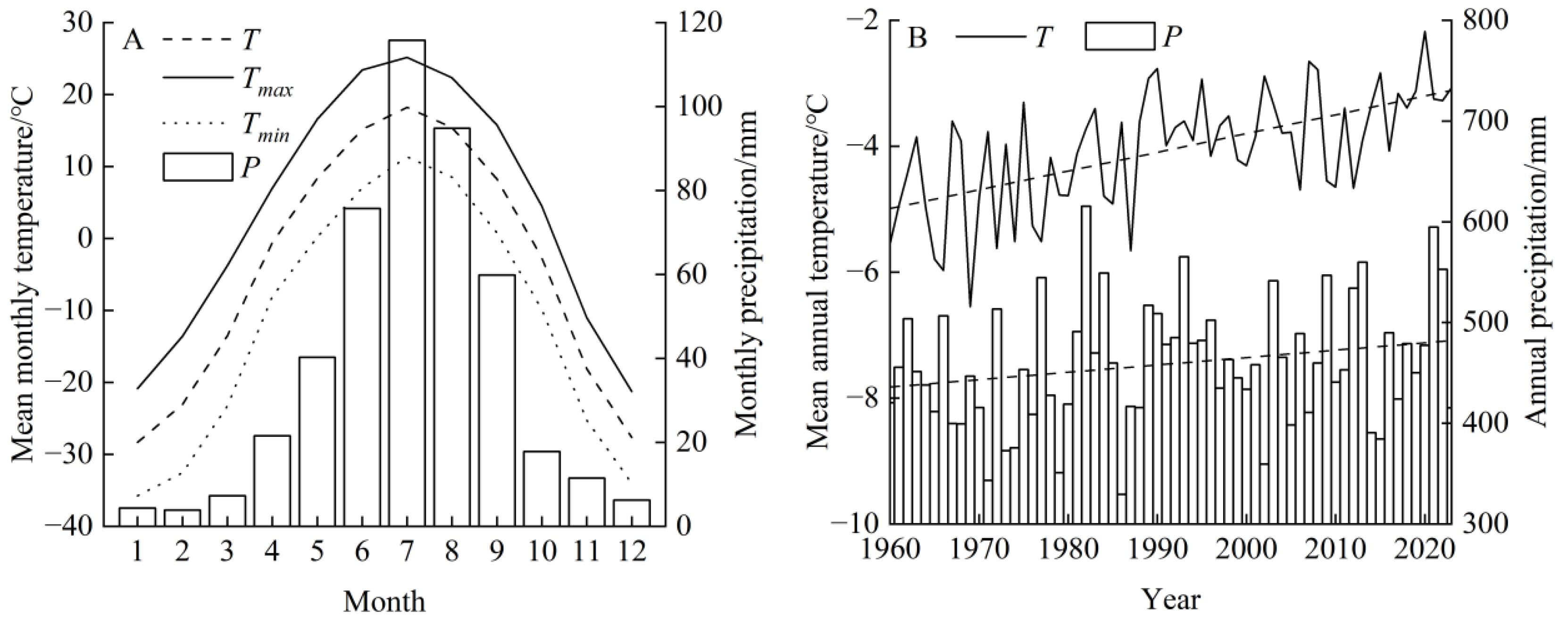 - Wang, Z.; Zhang, D.; Zhang, T.; Li, X.; Wang, X.; Luo, T.; Zhong, S.; Song, K. Reconstructing the Temperature and Precipitation Changes in the Northern Part of the Greater Khingan Mountains over the Past 210 Years Using Tree Ring Width Data. Forests 2024, 15, 1450. [Google Scholar] [CrossRef]