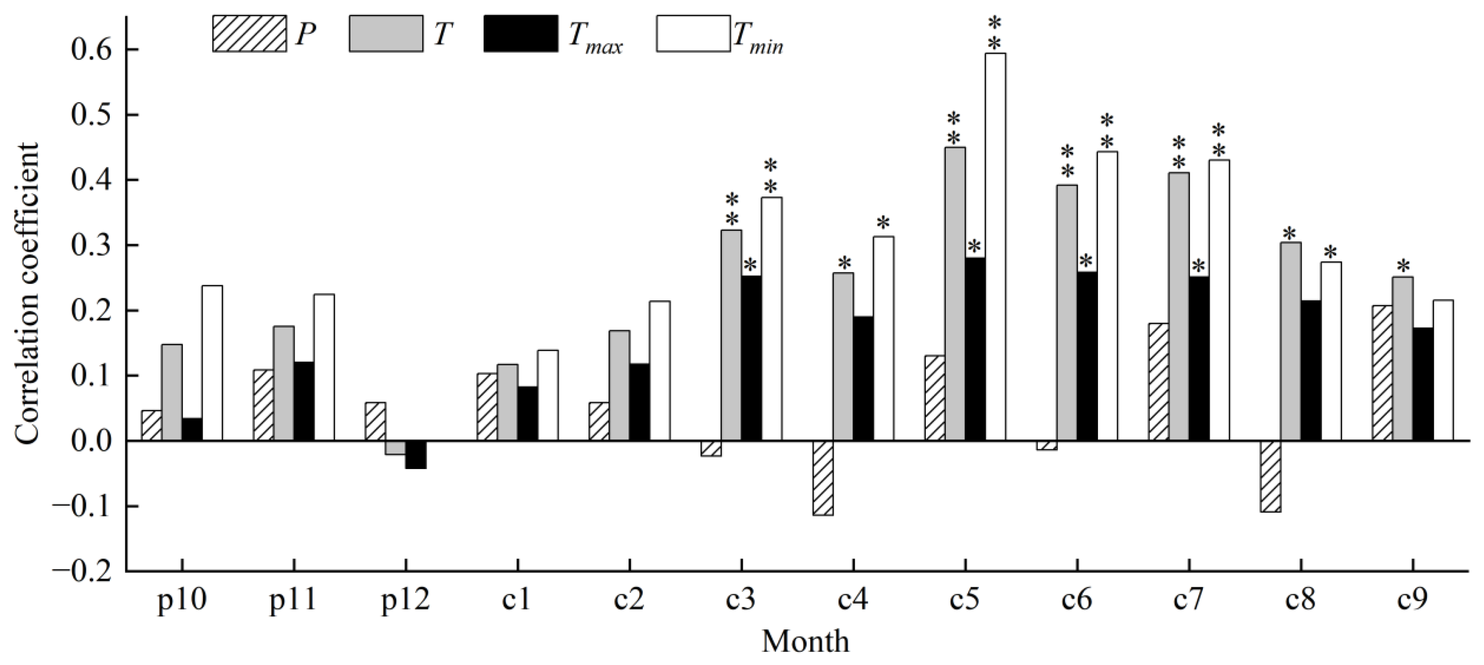 3.2. Response Analysis of Tree-Ring Chronology to Climate Factors