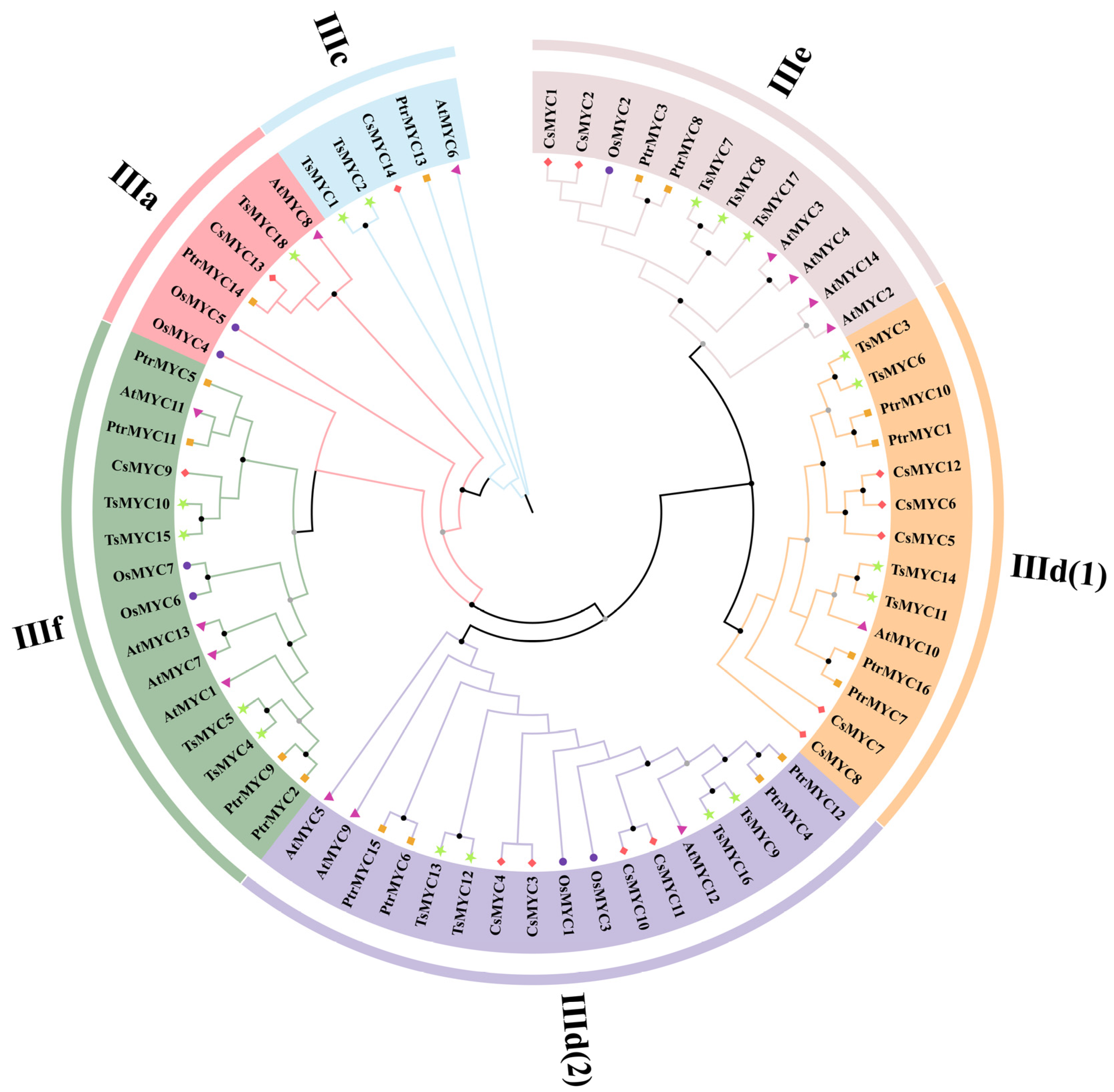 - Chen, S.; Kong, Y.; Zhang, X.; Liao, Z.; He, Y.; Li, L.; Hong, G. Structural and functional organization of the MYC transcriptional factors in Camellia sinensis. Planta 2021, 253, 93. [Google Scholar] [CrossRef] [PubMed]