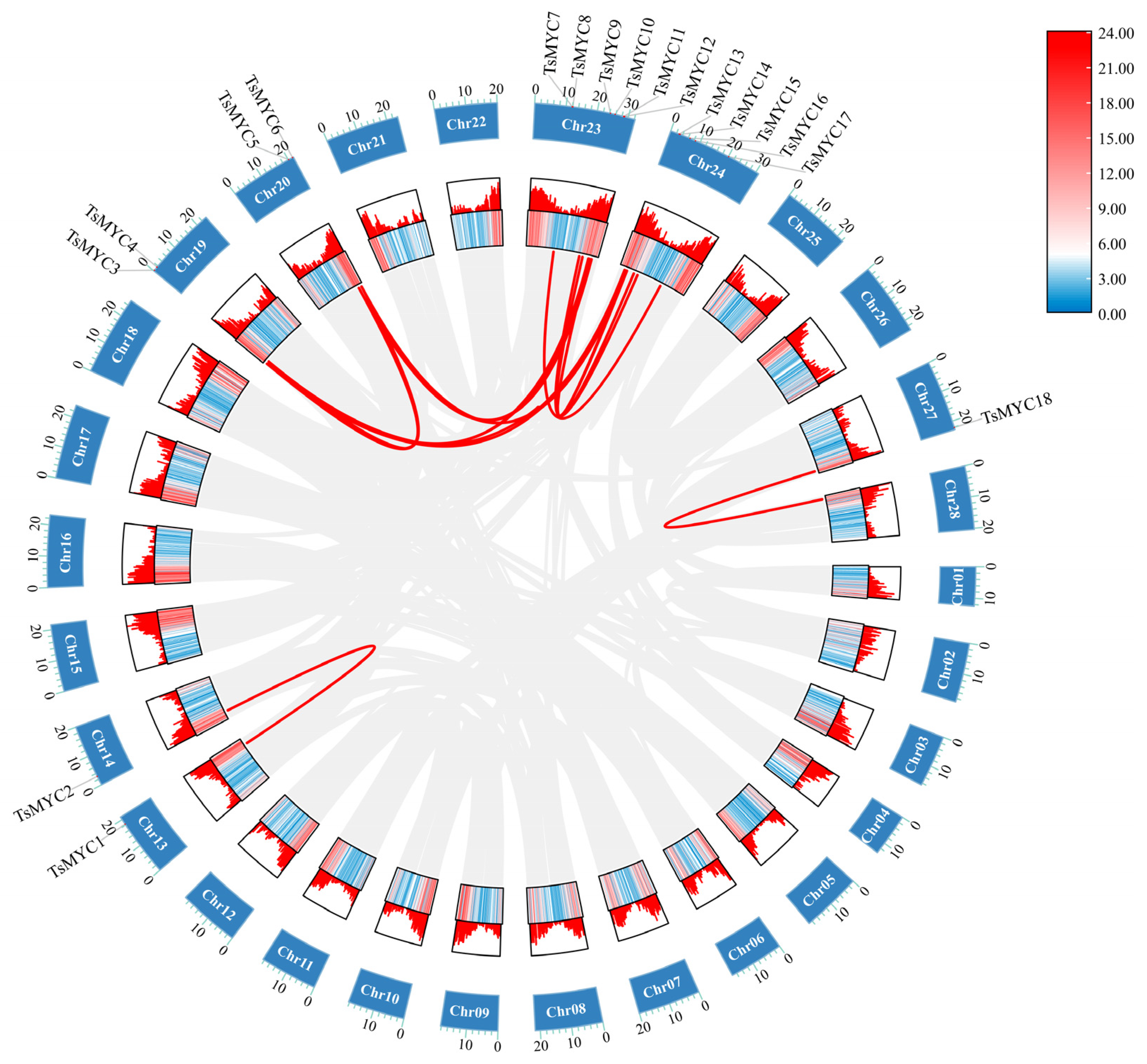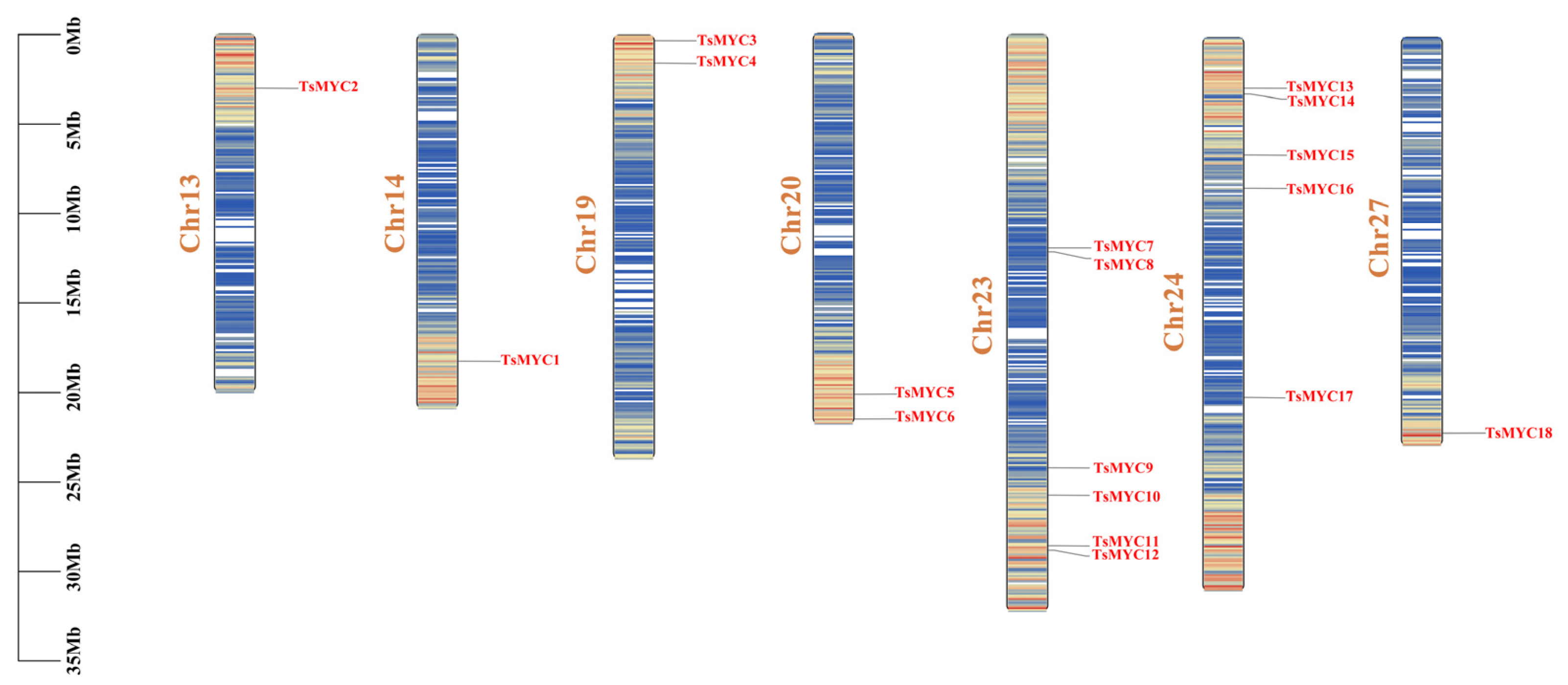 3.3. Chromosomal Localization and Synteny Analysis of TsMYC Genes