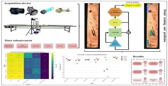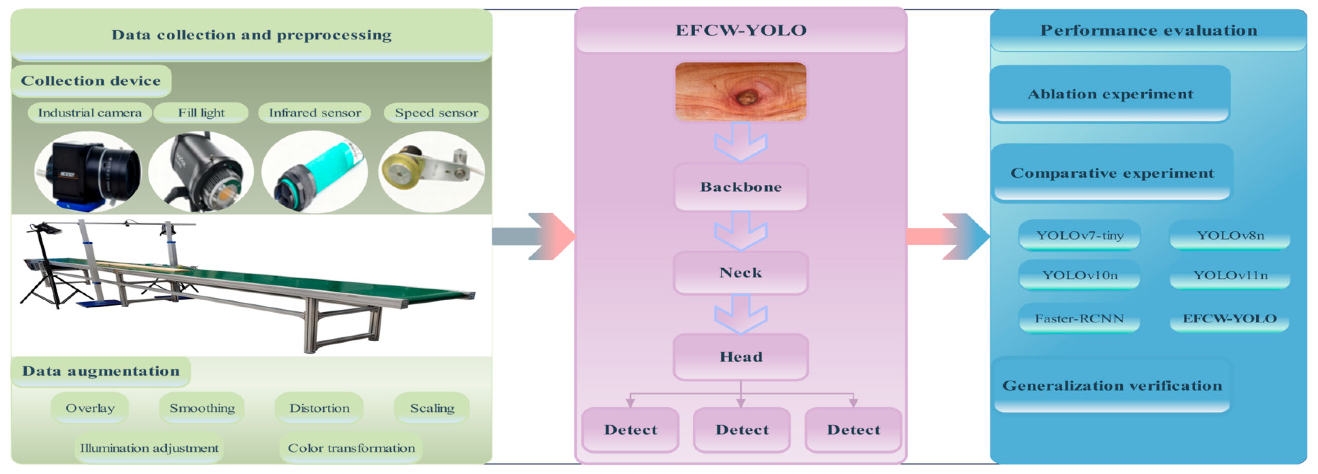 Figure 2 illustrates the comprehensive technical roadmap of this study, which encompasses the entire workflow from data collection to model deployment. The roadmap begins with data collection and preprocessing, where wood surface images are acquired using our custom-built imaging system. Subsequently, data augmentation techniques are applied to enhance dataset diversity and address class imbalance issues. The core of our approach is the EFCW-YOLO model, which integrates four key improvements over the baseline YOLOv8n architecture. The model’s performance is rigorously evaluated through ablation studies and comparative experiments with state-of-the-art detectors. Finally, generalization verification ensures the model’s robustness across different domains, as demonstrated through cross-domain testing on crop pest datasets.