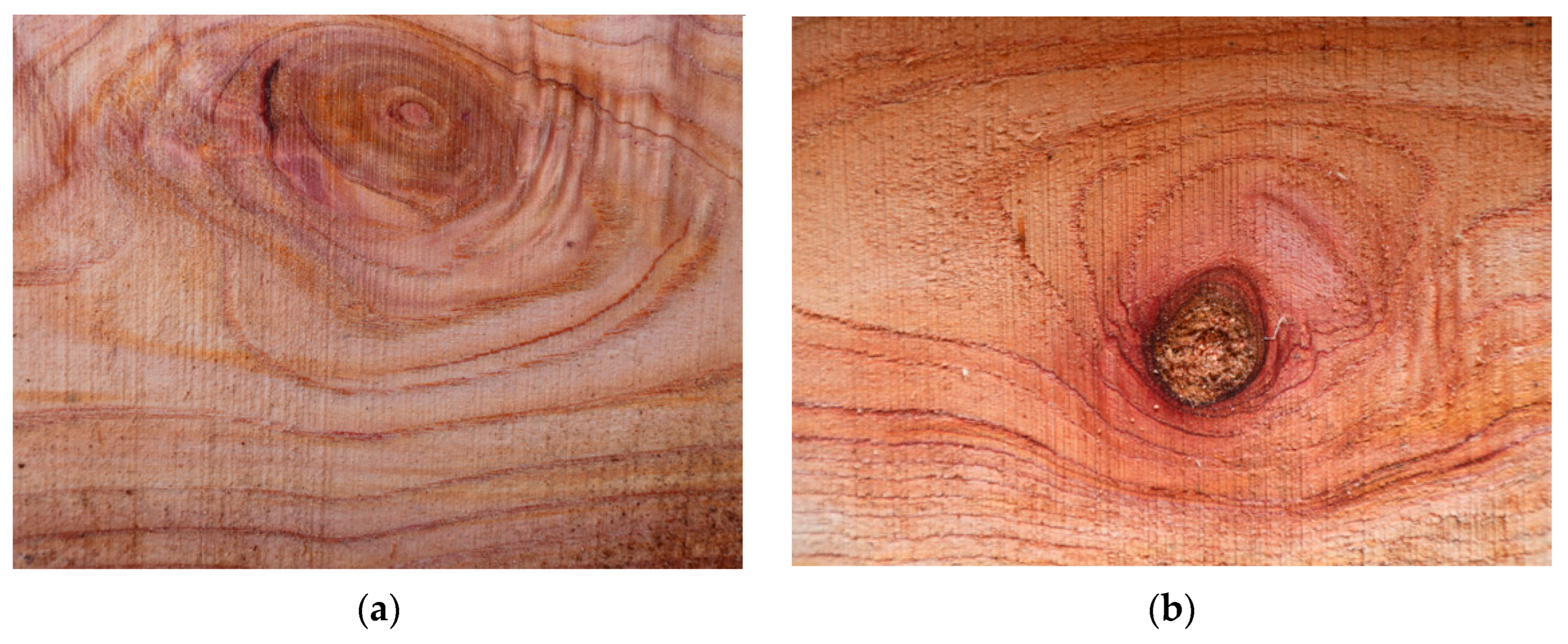 8]. Live knots and dead knots are common types of growth defects, as shown in