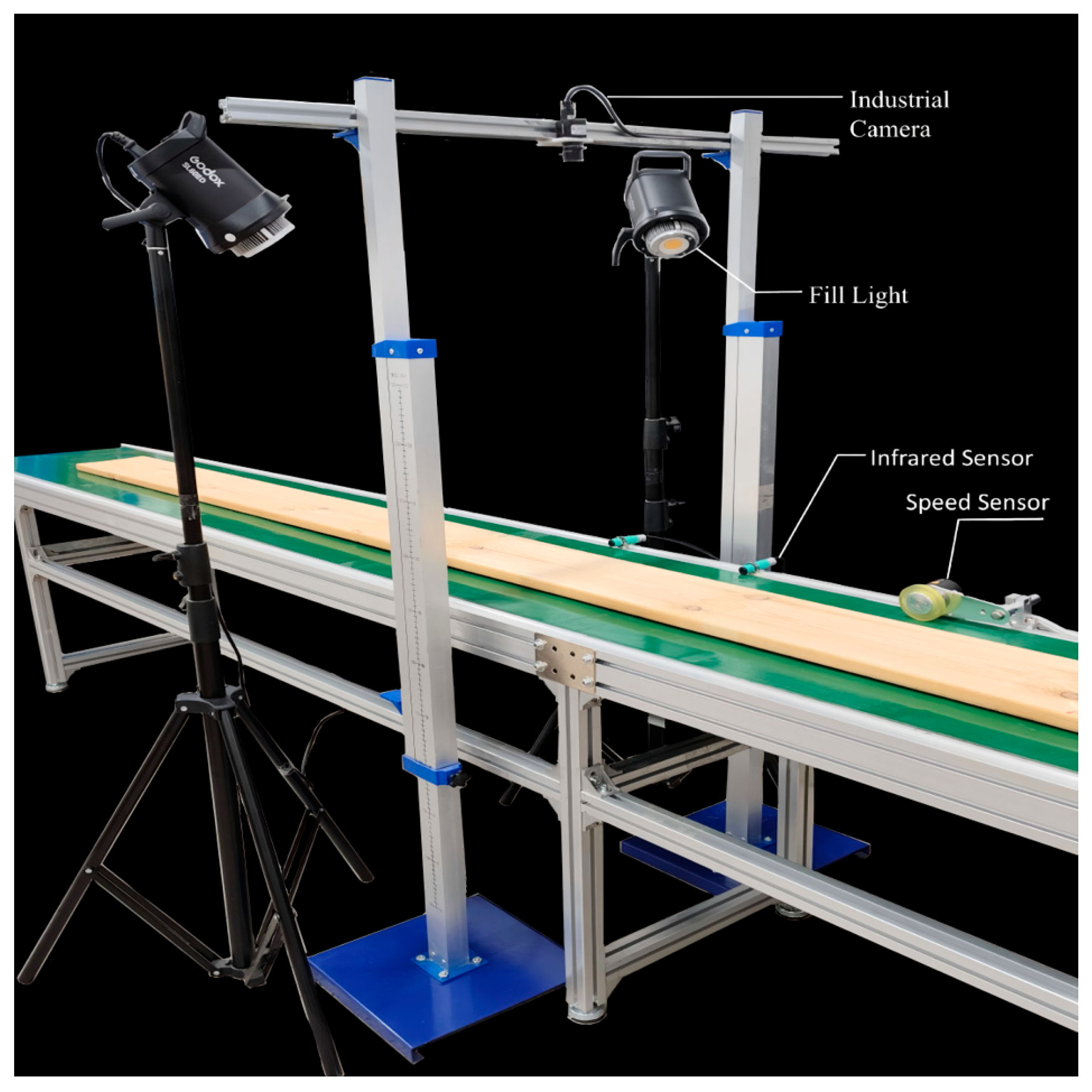 The image acquisition unit includes a high-resolution industrial camera (Hikvision Digital Technology Co., Ltd., Hangzhou, China) equipped with a C-mount lens (12 mm focal length), capable of capturing grayscale images with a resolution of 2048 × 1080 pixels. An infrared sensor detects the wood position and triggers image acquisition. The system uses an STM32 series microcontroller as the control core, processing sensor signals and calculating the optimal shooting timing based on conveyor belt speed feedback from an encoder, thereby controlling the camera for image capture.