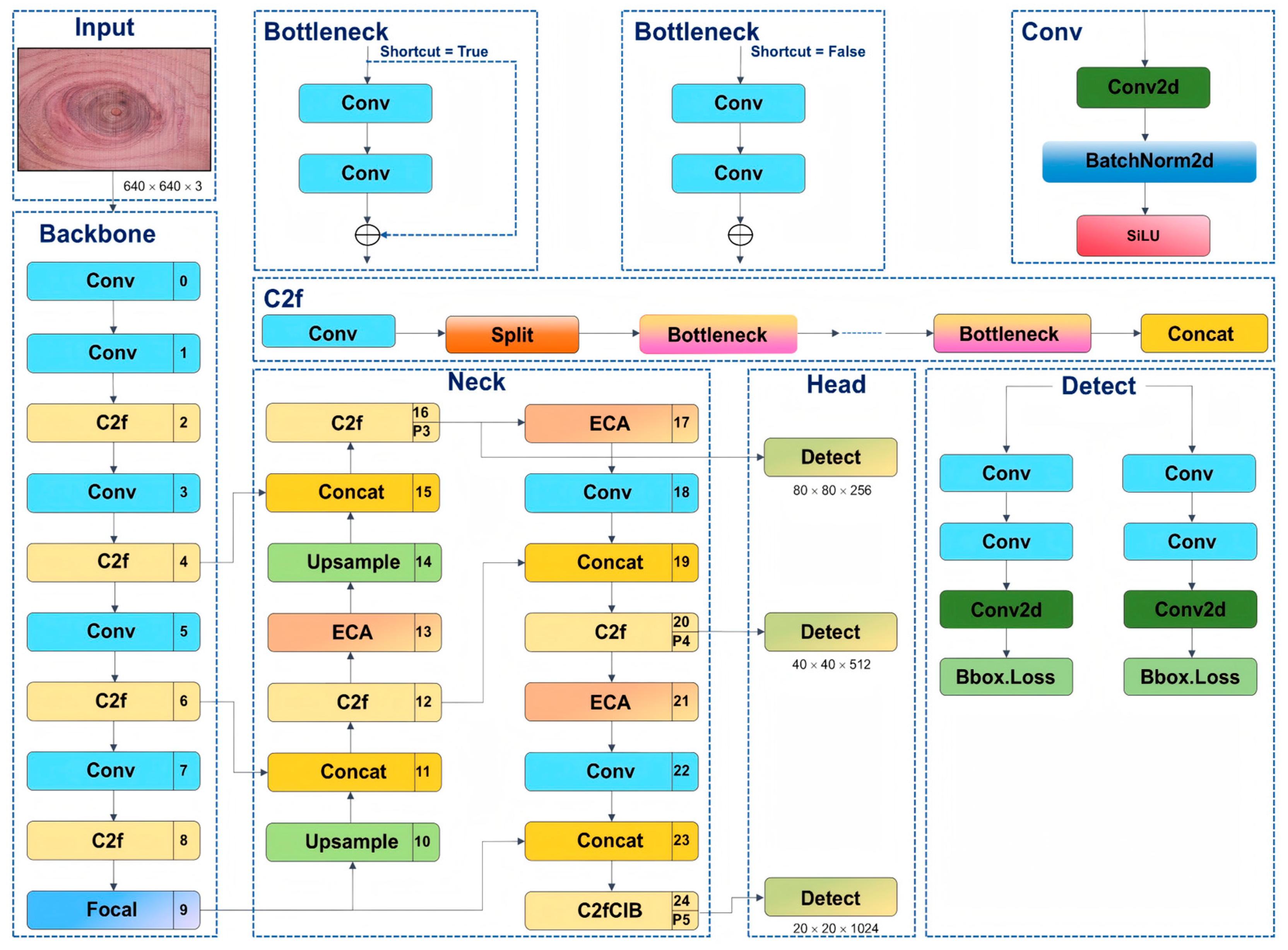 YOLOv8 introduces the C2f module incorporating the ELAN concept based on YOLOv5, adopts an Anchor-Free decoupled head, and improves both localization and classification accuracy through dynamic label assignment and refined loss functions. It offers five model scales (n/s/m/l/x) to meet different computational requirements. This study selected the smallest and fastest YOLOv8n as the baseline and embedded subsequent improvements into its backbone-neck-head structure to achieve lightweight and efficient wood detection.
