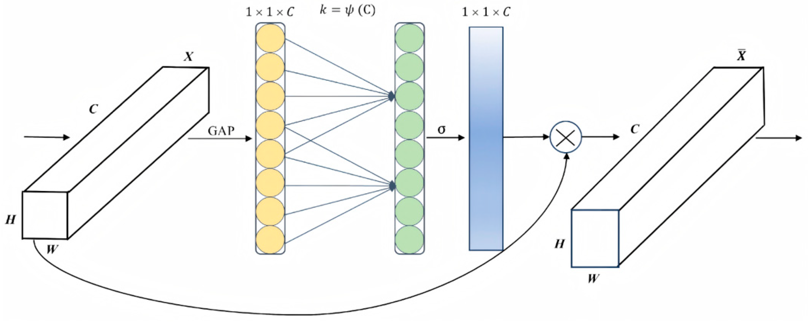44], is a lightweight channel attention mechanism improved upon SENet. It significantly enhances network performance with almost no increase in parameters through local cross-channel interaction. This approach avoids the adverse effects of channel compression and dimensionality reduction in SENet while introducing methods for local cross-channel interaction and adaptive selection of 1D convolution kernel size. The structure of the ECA module is shown in