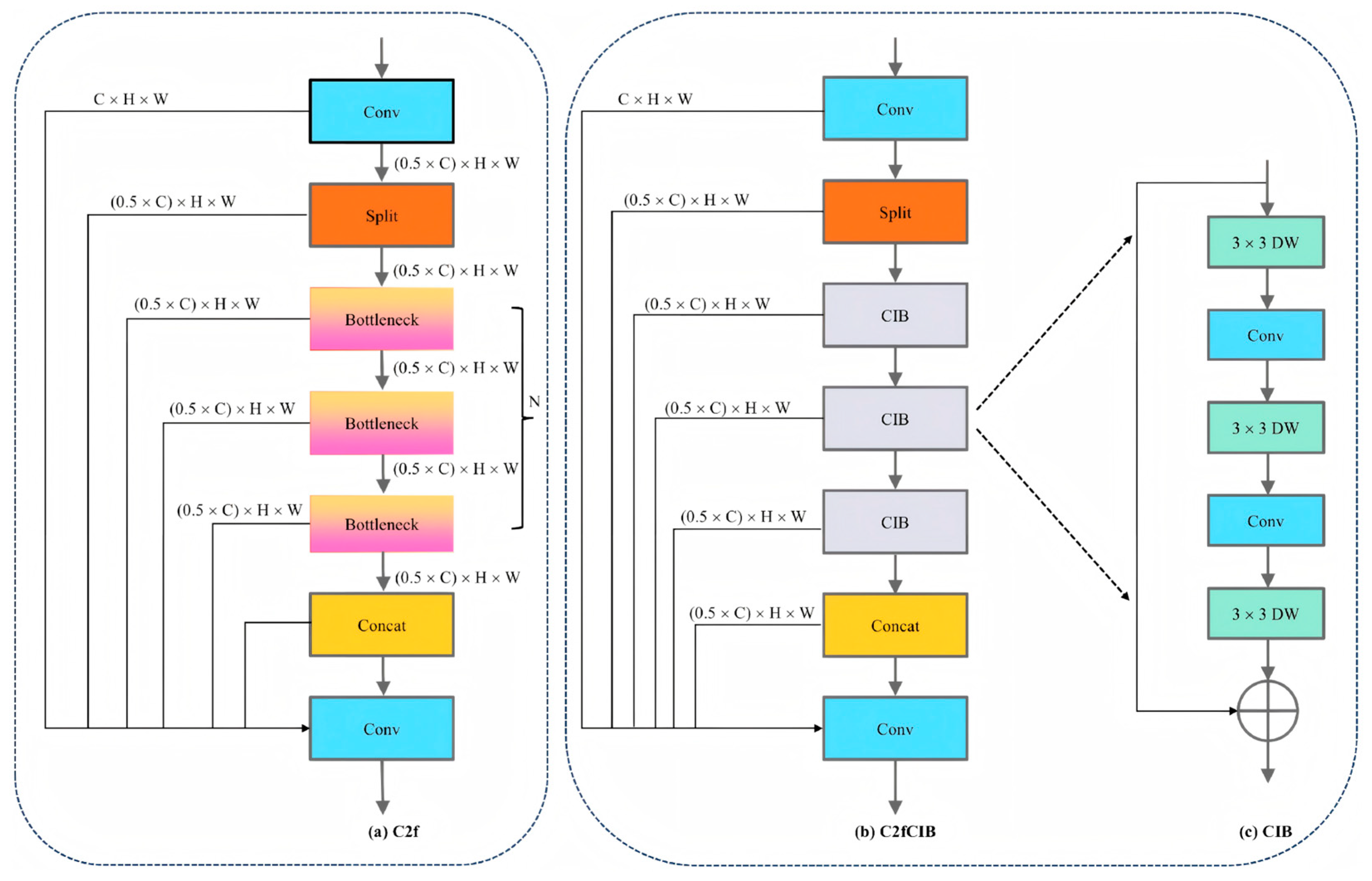 The head structure employs the C2fCIB module to optimize feature extraction, replacing part of the C2f modules with compact inverted blocks (CIB);