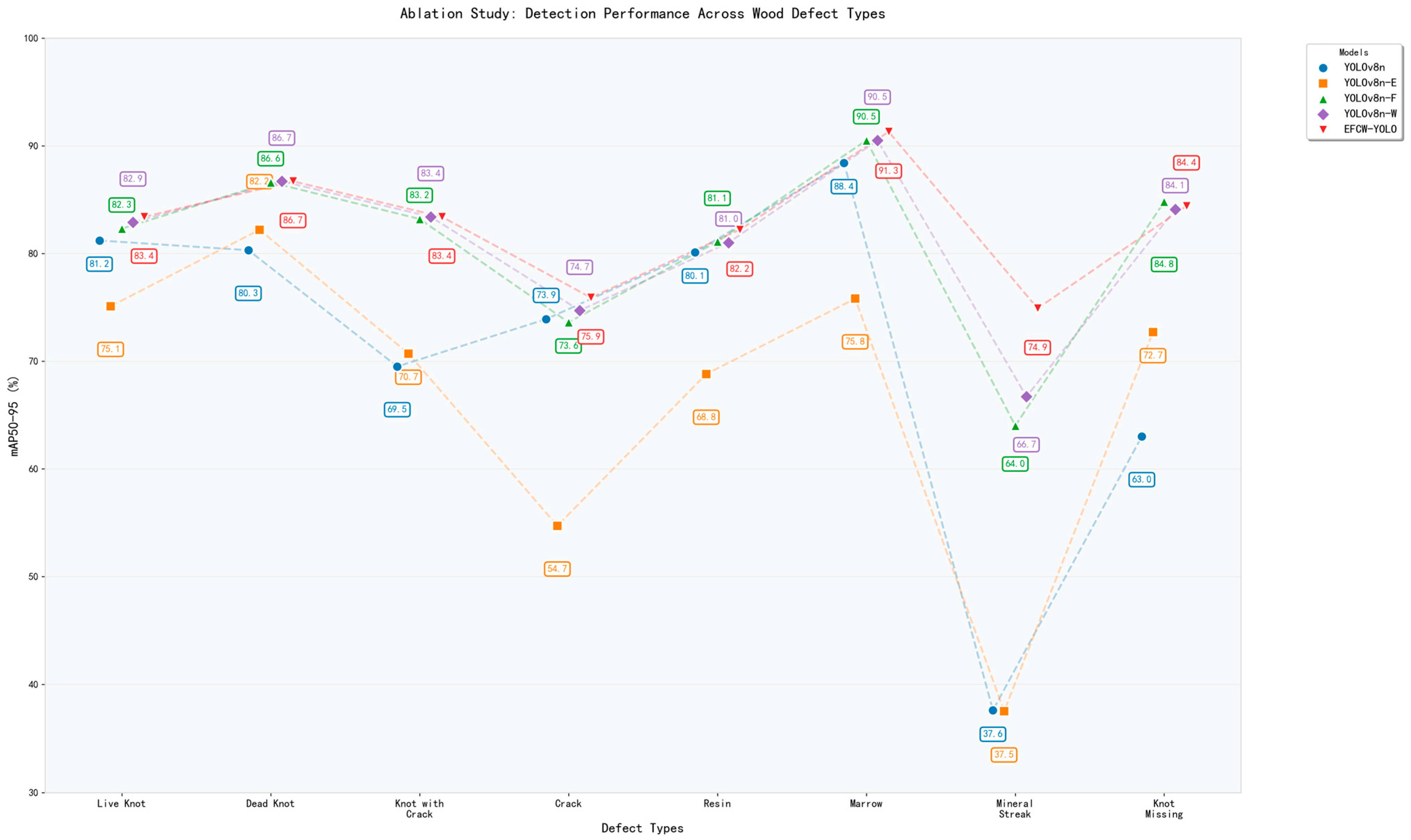 Analysis of the performance comparison across different categories yields the following key conclusions: (1) EFCW-YOLO maintained high mAP50-95 values (all exceeding 83.0%) for common defects such as Live Knot, Dead Knot, and Marrow. (2) The model’s advantages are particularly prominent when detecting challenging categories. Compared to the latest models like YOLOv10n and YOLOv11n, EFCW-YOLO’s mAP50-95 for Mineral Streak is significantly higher by approximately 19.1% and 11.2%, respectively. For Knot Missing, the mAP50-95 values are higher by about 9.7% and 1.2%, respectively.