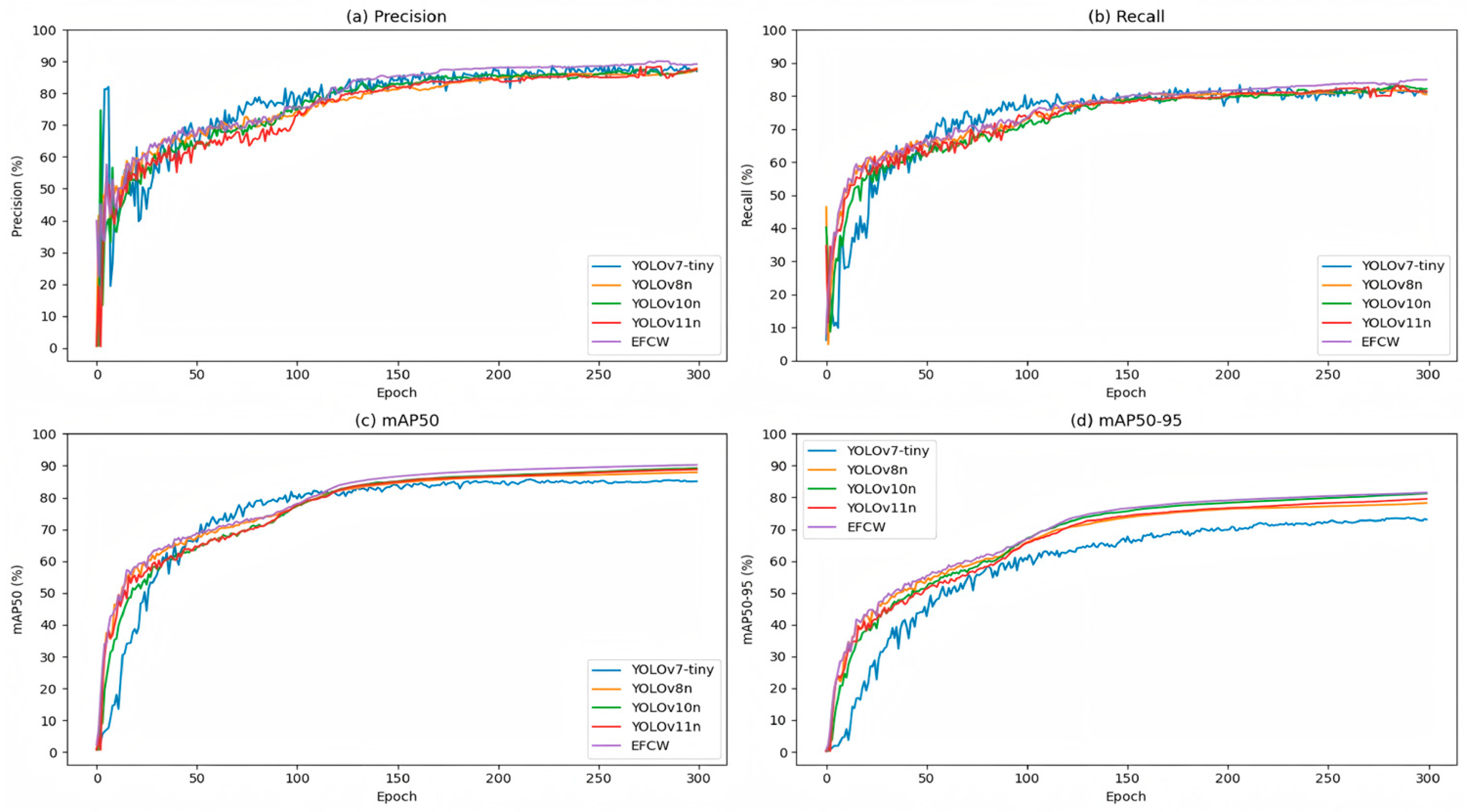 Figure 10d presents the mAP50-95 changes during training. The mAP50-95 values for YOLOv8n, YOLOv10n, and YOLOv11n ultimately stabilized around 77.00%. YOLOv7-tiny remained significantly lower than the other models throughout the entire training process. The EFCW-YOLO model’s mAP50-95 value was markedly higher than others from the beginning of training, continued to rise, and finally stabilized above 81.0%.