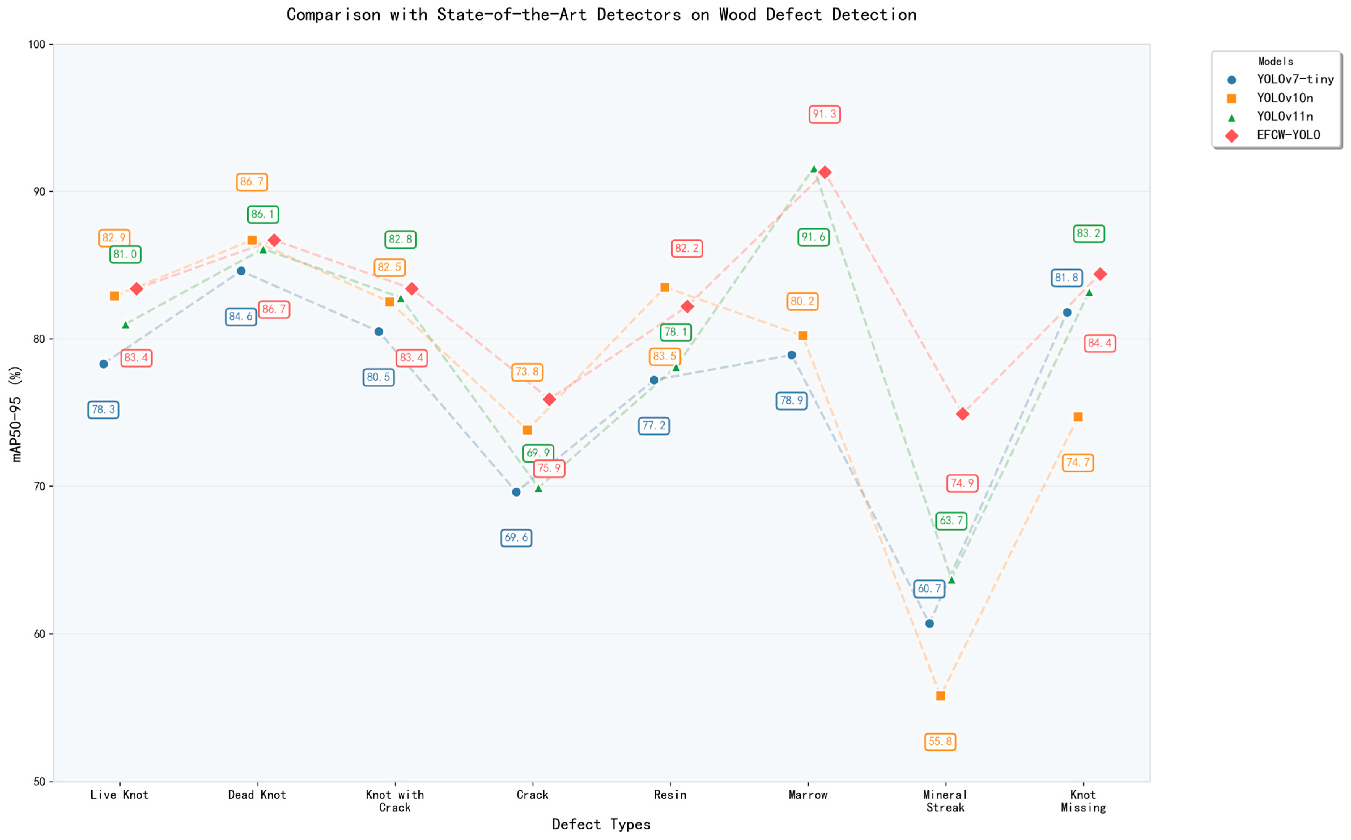 In summary, EFCW-YOLO provides an optimal solution for real-time wood surface defect detection, combining high accuracy and efficient computing performance. Manufacturers can use this model for automated quality control without affecting production speed.