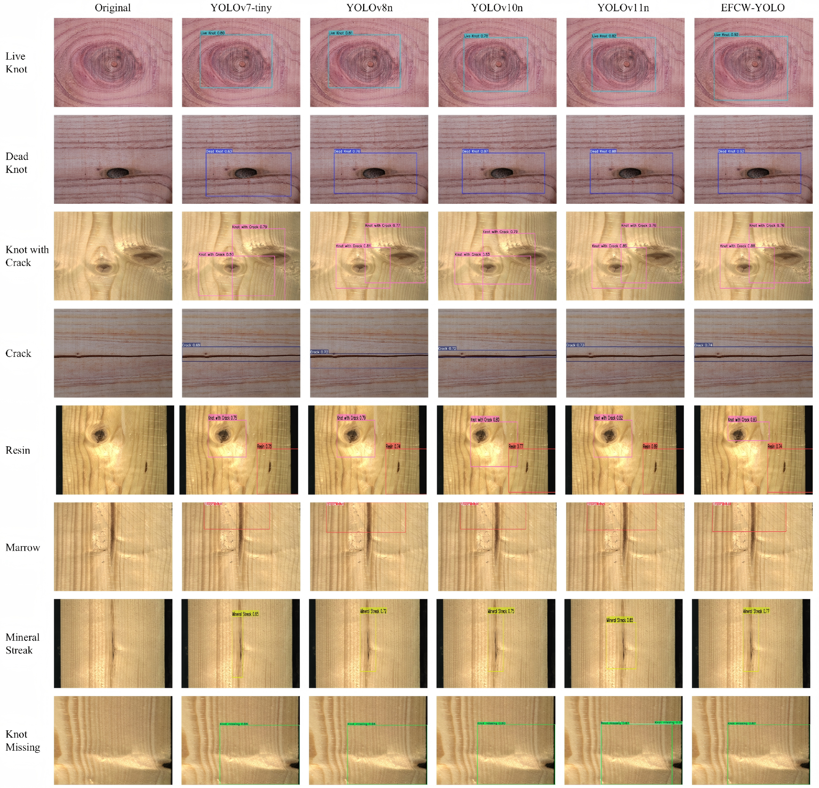 Table 8 demonstrate, the proposed EFCW-YOLO model demonstrates outstanding performance in detecting eight types of wood defects. The model achieves precision, recall, F1 score, accuracy, mAP50, and mAP50-95 values of 89.24%, 84.90%, 87.01%, 88.85%, 90.26%, and 81.50%, respectively. Compared to other models in the YOLO series (v7-tiny, v8n, v10n, v11n), the precision is improved by 2.34%, 3.14%, 1.64%, and 1.54%, respectively. Recall rates are improved by 4.85%, 4.50%, 3.50%, and 3.50%, respectively. The F1 score surpasses these models by 3.65% (YOLOv7-tiny), 3.85% (YOLOv8n), 2.61% (YOLOv10n), and 2.56% (YOLOv11n), confirming its superior overall detection effectiveness. In terms of accuracy, EFCW-YOLO achieves 88.85%, representing improvements of 4.43%, 4.55%, 3.50%, and 3.44% over YOLOv7-tiny, YOLOv8n, YOLOv10n, and YOLOv11n, respectively. The mAP50 values show increases of 5.53%, 2.86%, 2.56%, and 1.46%, respectively. Meanwhile, mAP50-95 values are enhanced by 8.71%, 4.20%, 1.00%, and 1.90%, respectively. Compared to the two-stage object detection algorithm Faster-RCNN, the P, R, F1 score, mAP50, and mAP50-95 metrics are improved by 33.68%, 3.32%, 20.94%, 20.55%, and 19.00%, respectively, with the accuracy improvement being particularly notable at 37.09%.