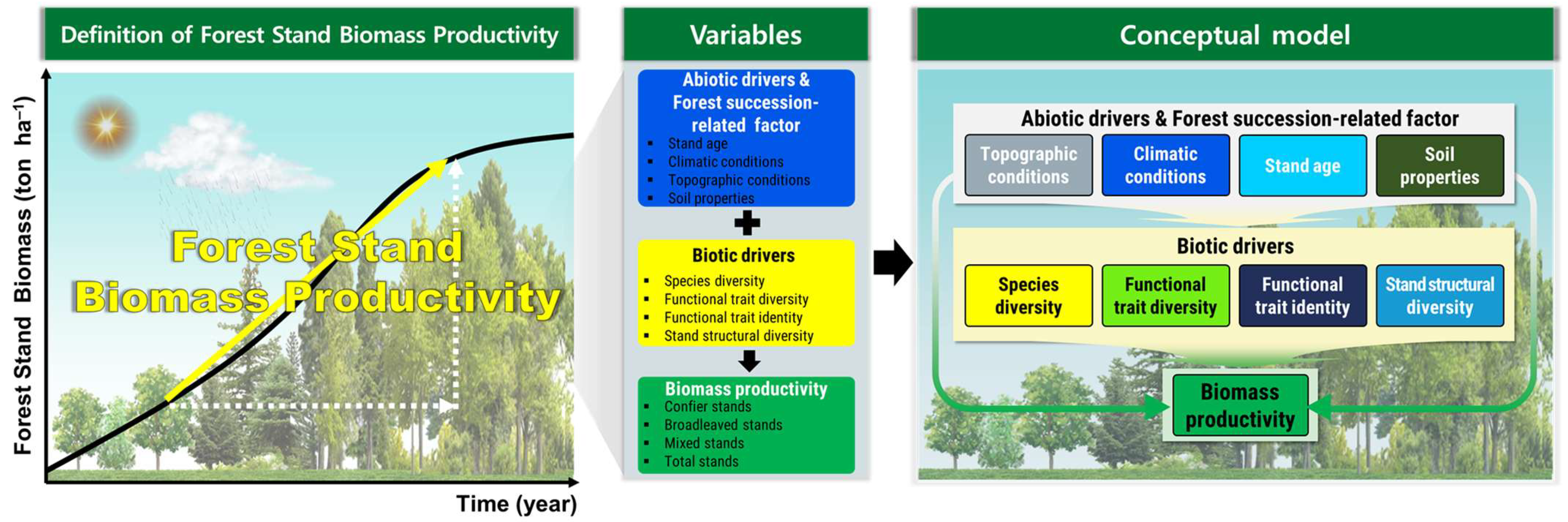 - Lee, Y.J.; Lee, H.I.; Lee, C.B.; Lee, K.H.; Kim, R.H.; Ali, A. Abiotic and stand age-induced changes in tree diversity and size inequality regulate aboveground biomass and soil organic carbon stock in temperate forests of South Korea. Catena 2024, 237, 107827. [Google Scholar] [CrossRef]