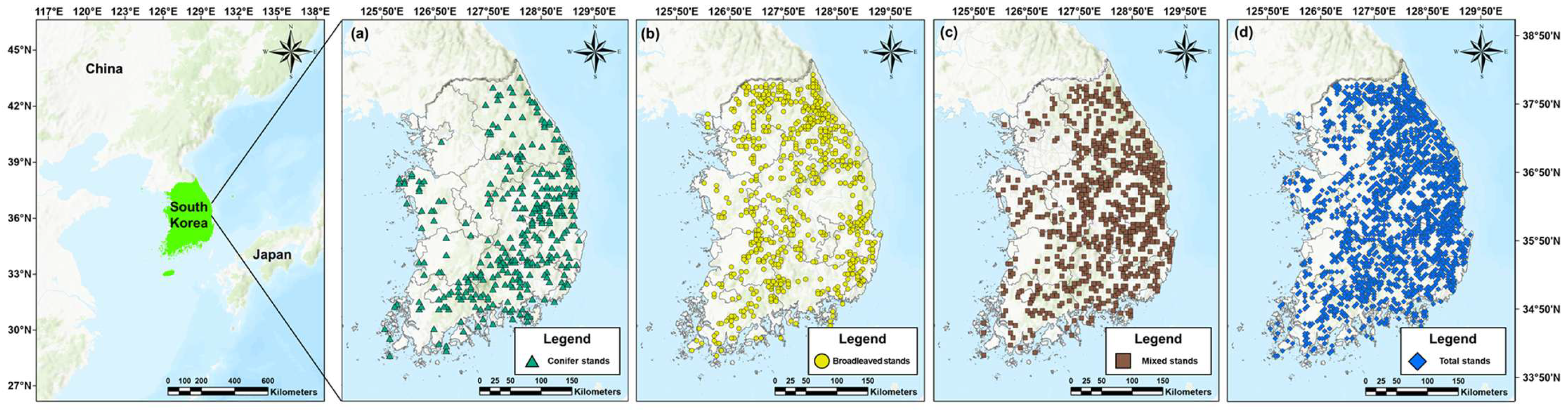 - Korea Forest Service. Guide to the Seventh National Forest Resources Inventory and Field Survey of Forest Ecosystem Health and Vitality; Korea Forest Service: Daejeon, Republic of Korea, 2017. (In Korean) [Google Scholar]