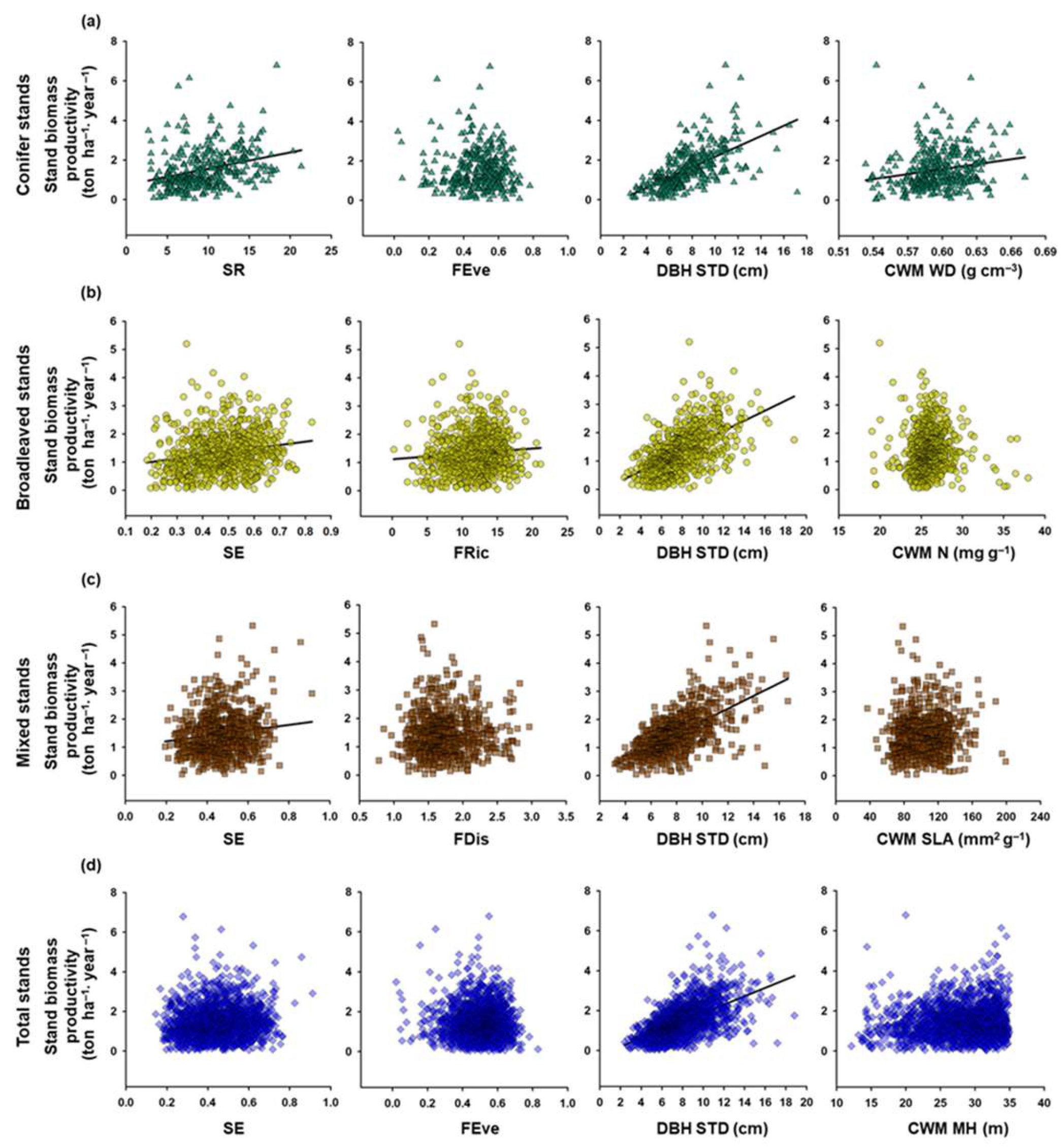 4.5. Abiotic and Biotic Drivers Controlling Stand Biomass Productivity in Temperate Total Stands