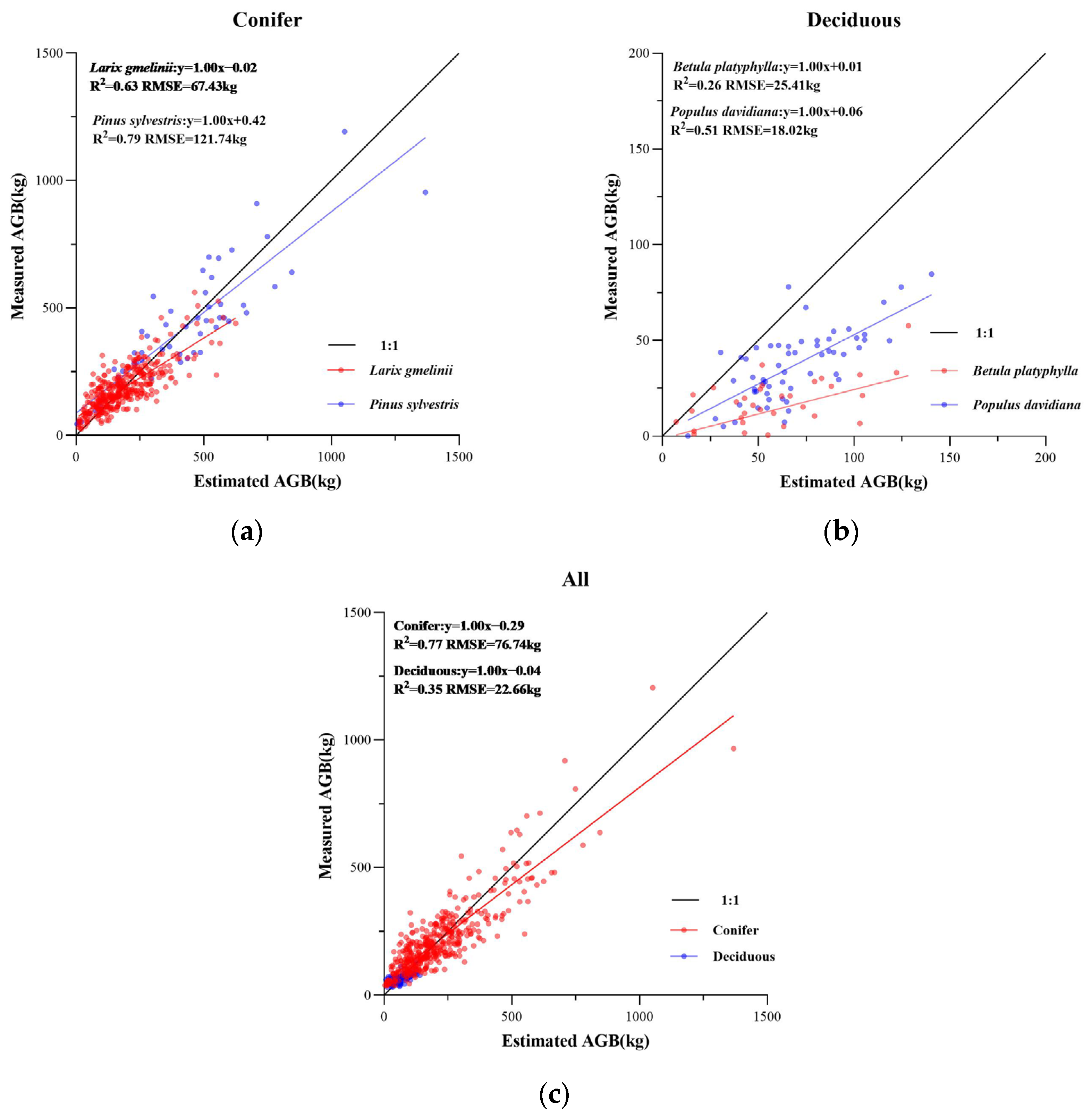 | Model | Larix gmelinii | Pinus sylvestris | Betula platyphylla | Populus davidiana | Coniferous | Deciduous | All | |