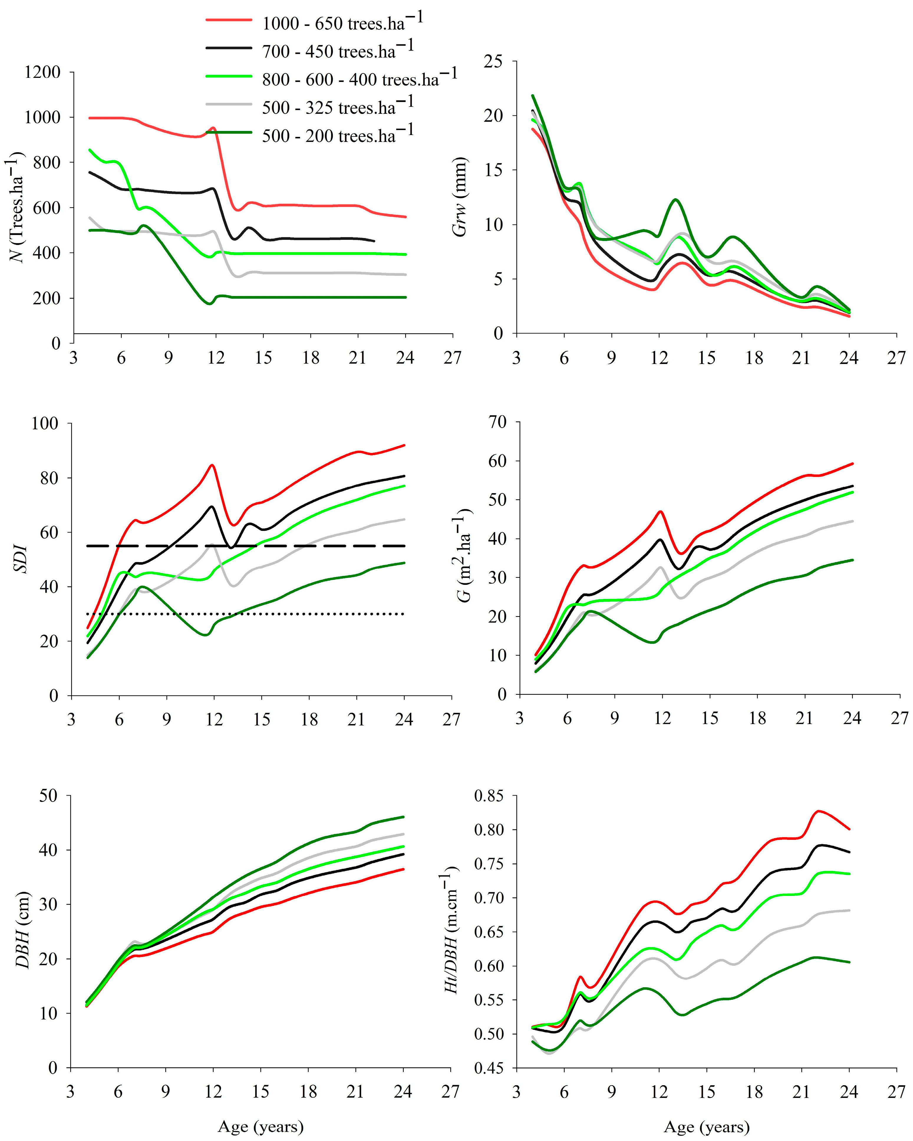 | Thinning Regime | Initial Density (Trees.ha−1) | Target Density after Thinning (Trees.ha−1) | Last Density (Trees.ha−1) | |||