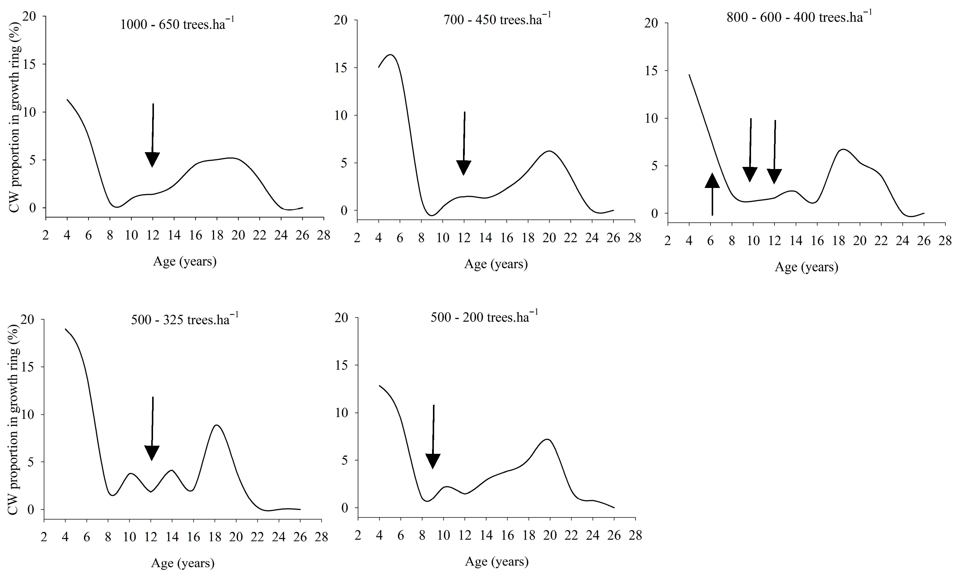- Cameron, A.; Thomas, K. Effect of thinning on the development of compression wood in stems of Corsican pine (Pinus nigra L.). Eur. J. For. Res. 2008, 127, 247–251. [Google Scholar] [CrossRef]
