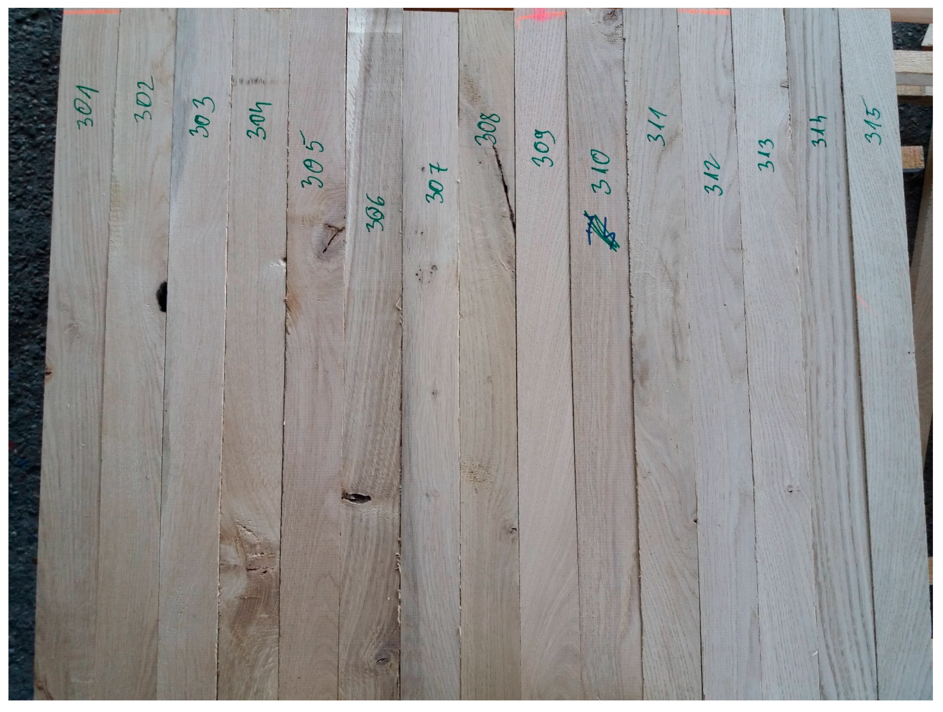 Quercus spp.) with a cross-section of 20 × 50 mm and a length of 500 mm in the grain direction, sourced from the Zala-Fűrész Wood Processing and Trading Ltd. (Lenti, Hungary). The other raw material was 5 × 100 × 1000 mm planed thin oak timber, henceforth referred to as veneer in this study. The total of 736 planed lamellae contained sapwood, slope of grain, and in some cases sawn surfaces due to their smaller thickness, as well as both sound and decayed knots of various sizes, etc. (