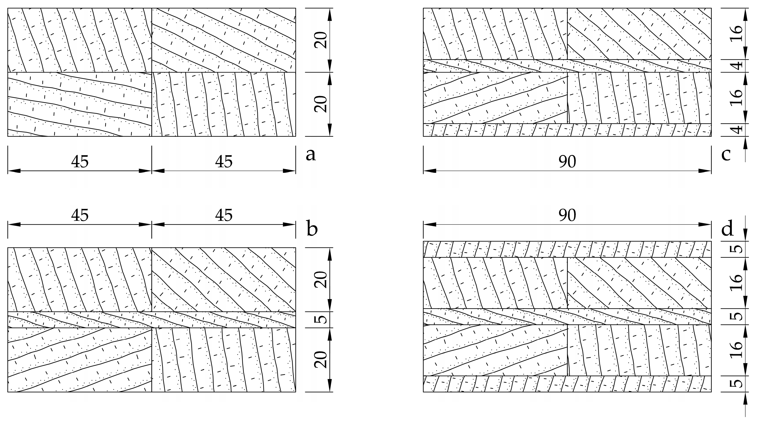 20]. The primary consideration in the test design of the four -layer sample was to examine the effect of reinforcement on the tension side. Therefore, a veneer was used on the tension side but not on the compression side. The aim of this solution was to confirm that, for an asymmetrical structure without reinforcement on the compression side, a significant improvement can be achieved with relatively thin reinforcement on the tension side.