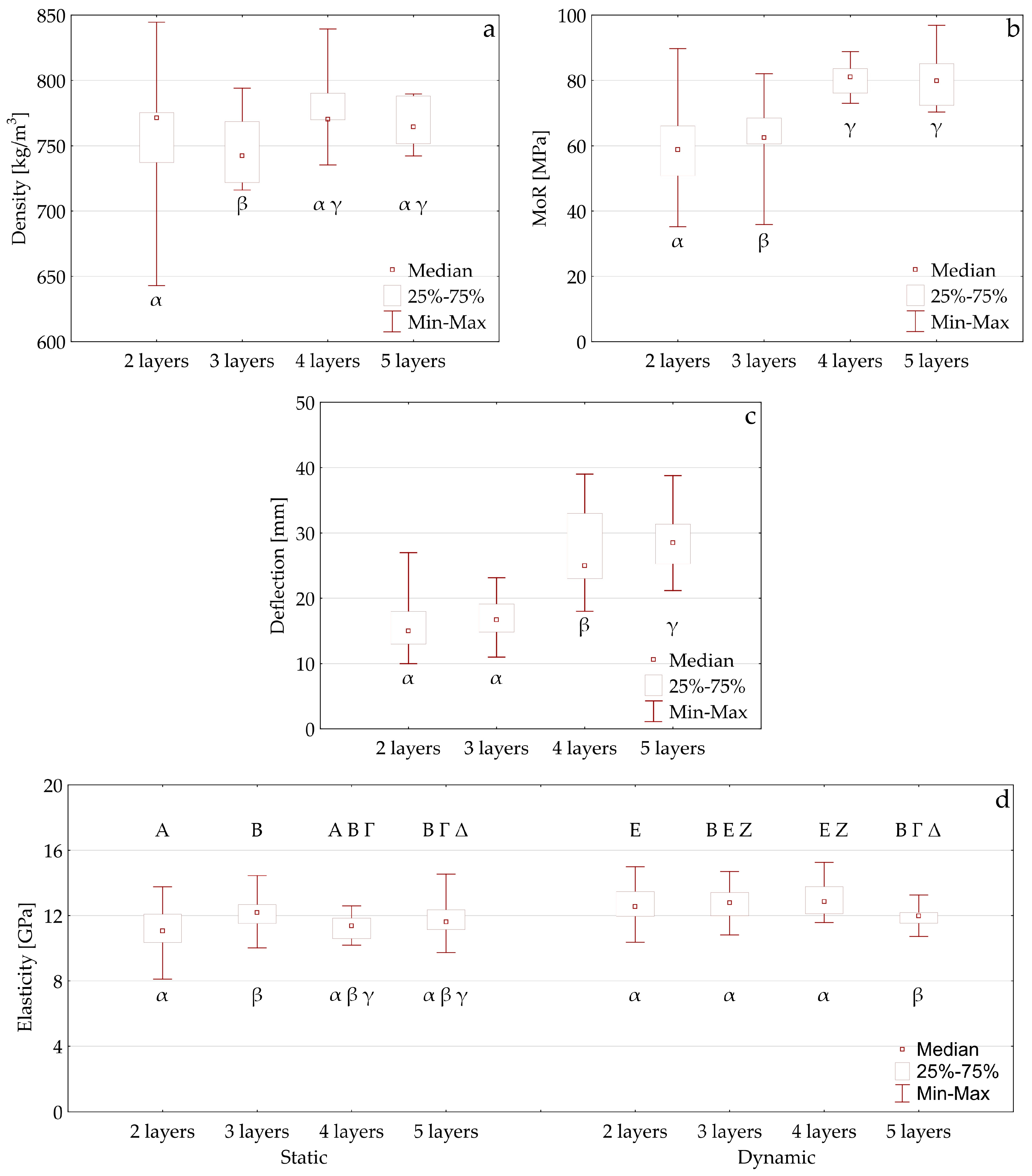 Prior to statistical analysis, any misleading results were removed arising from measurement errors. The outliers were not removed, but the results that were clearly false due to testing errors were. An example of this is the inappropriate automatic selection of data points from the displacement–force curve generated during the bending test, where data points were used to calculate the MoE. Consequently, a total of 136 MoR, 138 MoE, 145 deflection and 146 MoEdin and density results were subjected to statistical analysis and evaluation. A one-way ANOVA Fisher-LSD test was applied at a significance level of 0.05 using a TIBCO Statistica version 14.0.1.25 software (TIBCO Software Inc., Palo Alto, CA, USA).