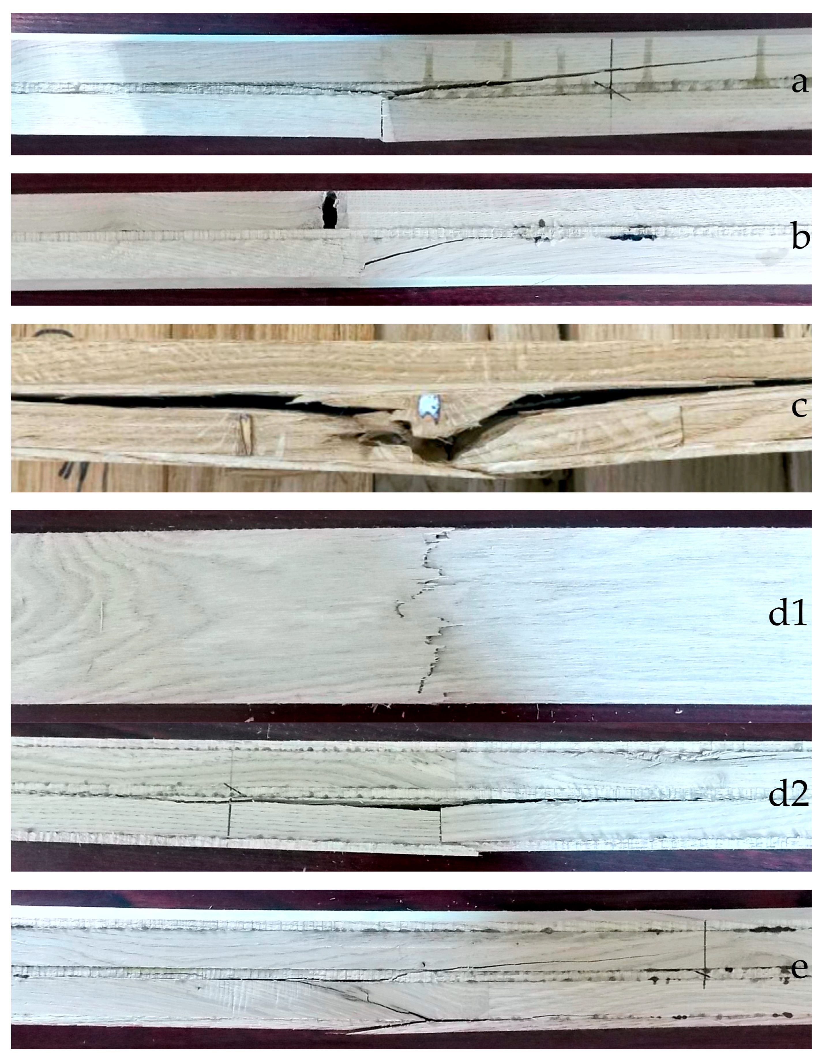 Figure 3a,d). At the finger joints, the adhesive strength cannot fully replace the natural tensile strength and shear strength of solid wood in the grain direction. Developing a specialized adhesive and its application for this purpose would be worthwhile, as it could significantly increase the strength values of oak beams. The opening of the finger joints caused such a pronounced weakening that the entire structure failed suddenly. Mostly, the bond line between the flat surfaces split along the length of the beam, eliminating the tensile support of the upper or inner lamella layers, consequently causing a fracture, too. Another major cause of failure was the slope of grain. In many cases, similar to the finger joint failures, the lamellae split almost across their entire cross-section due to the pronounced slope of grain (