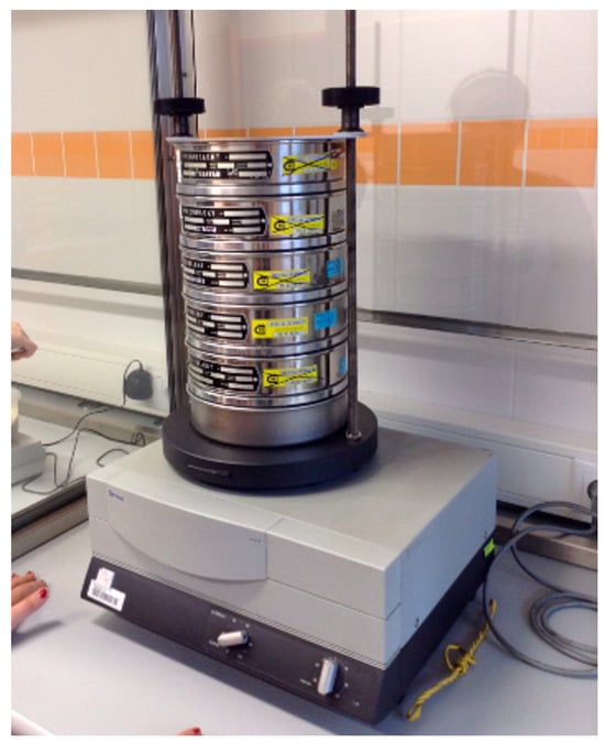 To determine the percentage of dust particle sizes in the collected mass, granulometric analysis was used, which divided the sample mass into individual size ranges based on the sieves used (captured mass on a given sieve with a defined mesh size). Based on the gravimetric weighing of the trapped dust mass on the respective sieve with the given mesh size, their percentage was calculated. For the examined samples, sieves with the size of the holes corresponding to the technological process were selected. Sieves (1, 32, 40, 45, 63, 75, 90, 106, 125, 150, 180, 250, 500 μm) were used to determine the specific percentage of dust fractions. We selected these sieve meshes because they cover a wide, representative range of particle sizes, which is critical for assessing the risks associated with sanding dust, especially in the context of occupational health or fire and explosion risks. Sieves with a size below 100 μm were particularly important, as this dust is inhalable. The oscillation frequency was set to 75 on the device, and sieving was carried out with an additional mass of 50 ± 1.0 g in 15 min. The procedure was repeated 5 times to obtain a more accurate representation of wood dust particles in each sample. The results present the calculated percentage by weight of the total mass captured on the relevant sieve of the given size. Since the size of the dust in this case is determined by the flow through a sieve with a given mesh size, the presented results only relate to the size range in which the given chip was located. In the case of sieving sanding dust, 3 to 4 Teflon balls were inserted into sieves with mesh sizes of 125 μm, 080 μm, 63 μm, and 32 μm to prevent dust particles from coagulating and forming clusters of dust fractions of different sizes in the shape of a ball. The Retsch AS 200 Basic Analytical Sieving Machine (Retsch GmbH, Haan, Germany) used is shown in Figure 1. The amount of residue retained on each sieve was determined by weighing the samples on a high-precision Radwag KERN PLT digital laboratory balance (KERN and SOHN, Balingen, Germany), which has a weighing accuracy of 0.001 g.