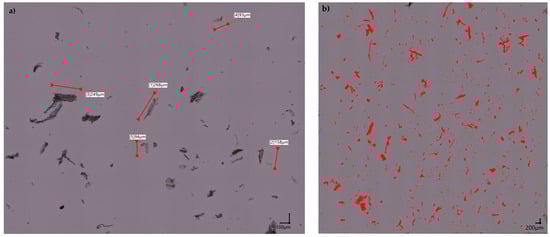 In the next step, a digital microscope was used to analyze the particle dimensions. This was automatically performed by the “Particle Analysis” software Keyence VHX-7000 microscope (Keyence Corporation, Osaka, Japan). An example of automatic particle detection can be seen in Figure 5b. The sieve analysis only shows the range (lower and upper) of particles on the sieve where the highest mass of dust particles was captured. However, the digital microscope provided information about the dimensions of individual dust particles through analysis. At the same time, it was also possible to analyze very small particles that were trapped on the 1 μm sieve (i.e., determine the particle size in the range from 1 μm to 32 μm). This microscopic analysis was used to determine the average dimensions of dust particles, dEC (diameter of a circle with equal projection area) according to [], aspect ratio calculated according to [] and the maximum and minimum dimensions in a 2D projection.