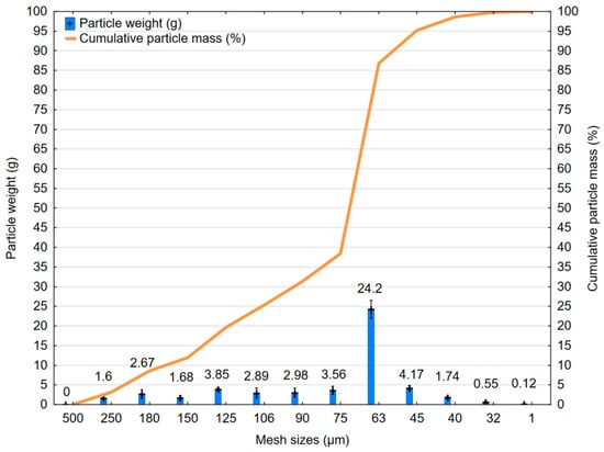 The results of the sieve analysis of wood dust are shown in Figure 6. The resulting weight and percentage composition of the sanding dust are the arithmetic means of three sieve analyses. The F-test showed that the sizes of dust particles captured on individual sieves varied statistically significantly (p-level < 0.00 at the α = 0.05 significance level). The values in Figure 6 represent the masses of dust particles collected on the individual sieves of the instrument in grams, as well as their relative amount. During sieving, the polydisperse system is completely divided into individual groups. These groups contain particles with a size within certain limits given by the dimensions of the sieves used. Figure 6 shows that the highest mass (23.37 g) of captured wood dust particles was in the range of 63 μm to 75 μm. This group contained up to 46.74% of the total sieved particles of wood dust. The second most numerous group was from 45 μm to 63 μm, with 8.99% of the particles represented. Since spruce dust particles are larger than deciduous wood species, with a demonstrably elongated shape (see the microscopic analysis), some dust particles were also found in the range from 250 μm to 500 μm (3.20%). This supports microscopic analysis, in which longer fibrous particles were discovered in the dust samples analyzed. Figure 6 also shows that the most abundant particle size (median) was in the range of 45 μm to 63 μm, similar to the study of []. This is a smaller size of dust particles than in the case of [], where the average value of spruce dust particles was at a level of approximately 325 μm (for P60). The small dust particle size in this experiment could have been caused by finer sanding on a belt sander. Compared to the studies of [,], it also follows that dust particles are larger than those of wood species with a higher density (hardwoods). From the values in Figure 6, it is evident that almost half of the particles were captured on a sieve with a mesh size of 63 μm, while in the case of oak and beech in the study of [], the largest fraction of particles was below 32 μm. The reason for the larger particles is that less dense spruce wood is less resistant to woodworking processes [,]. The above results show that dust particles from sanding are more likely to be wood powder according to the technical standard ISO 17225 [].