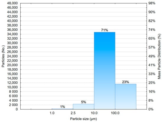 The sieve analysis (Figure 6) revealed the overall distribution of dust particles. Nonetheless, in the context of workplace hygiene, it is crucial to assess dust particles smaller than 100 µm, i.e., the inhalable and respirable fraction. For this purpose, a Keyence VHX-7000 digital microscope (Keyence Corporation, Osaka, Japan) was used. Figure 7 illustrates the particle size distribution of dust particles generated during sanding. The results indicate that the largest proportion of dust mass, approximately 71%, is concentrated in the size range between 10 µm and 100 µm. Coarser particles larger than 100 µm account for 23% of the total dust mass. Particles smaller than 10 µm (thoracic fraction) represent 6% of the total. The proportion of particles below 2.5 µm (respirable fraction) in the analyzed sample was 1%.