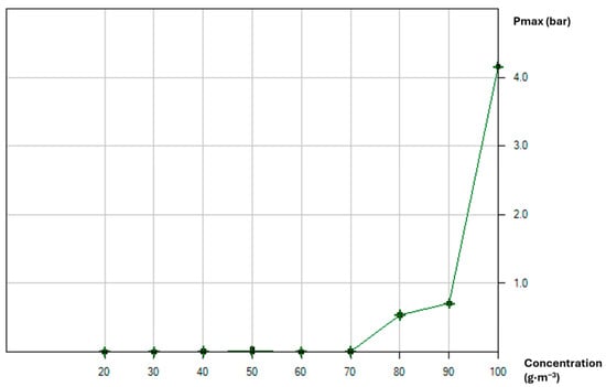 At a concentration of 80 g·m−3, the device measured an explosion pressure of 0.05 MPa. This was the lowest concentration of dust dispersed in the air that could lead to ignition []. It is an increase in pressure that was created by the explosion. From this curve, we determine the lower explosion limit of wood dust from the sander at a concentration of 80 g·m−3 (Figure 8). This concentration of wood dust is higher than in the studies of [,]. The authors measured the LEL for spruce dust particles (from 20 μm to 71 μm) at a concentration of 50 g·m−3 and for dust particles (from 71 μm to 125 μm) at a concentration of 60 g·m−3. In the case of this experiment, the largest dust particle ratio was in the range of 63 μm to 75 μm (Figure 6), and the lower explosion limit of the dust was 80 g·m−3 (Figure 8). The explanation for the LEL value we have measured may be the higher moisture content of the wood compared to the study of []. The authors further stated that the LEL value decreases with a decrease in the size of the dust particles. This is probably another reason why the LEL values in Figure 8 are higher. In Figure 8, a sharp increase in pressure above a concentration of 90 g·m−3 can also be observed. This sharp increase is typical when the concentration of dust is high enough to ensure good flame spread. A further increase in concentration quickly increases the amount of fuel available for combustion, resulting in a much higher release of energy and consequently much higher pressure.