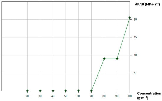 The rate of increase of explosion pressure depending on the concentration of a given wood dust is shown in the graph. We can notice that up to a concentration of 70 g·m−3, the value is zero. At a concentration of 80 g·m−3, the explosion pressure build-up value rises to 0.9 MPa. Subsequent concentrations also show values of explosion pressure build-up, indicating an explosion in an explosion autoclave (Figure 9).
