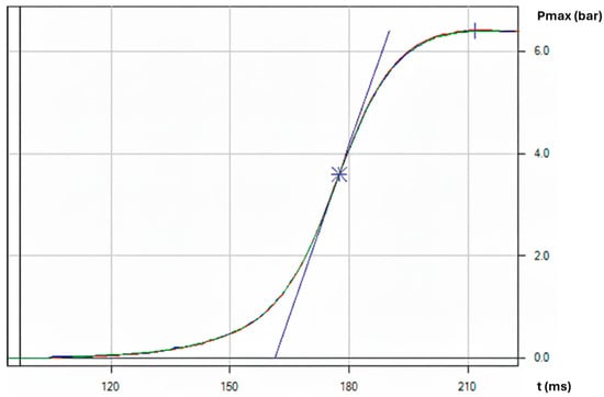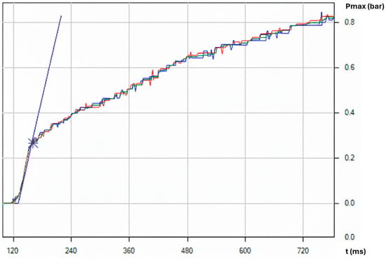 Figure 10 displays the explosion curve for a concentration of 80 g·m−3, which was previously determined to be the lower explosion limit. The curve shows the force of the explosion pressure as a function of time. Pressure rose sharply between 50 and 120 ms, as indicated by the curve. The increase in pressure was due to the spread of flames in the dust cloud and due to the production of a large volume of hot gases.