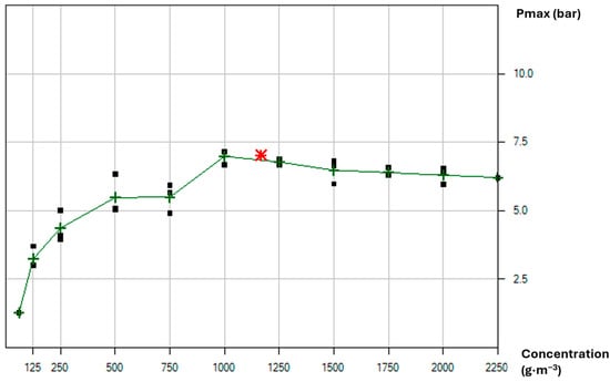 From the explosion graph (Figure 11), it can be determined that the maximum explosion pressure of 7.4 bar is at a concentration of 1000 g·m−3. The increase in pressure at a concentration of 1000 g·m−3 was statistically significant according to Duncan’s post-hoc test. The explosion autoclave determined the average maximum explosion pressure between concentrations of 1000 g·m−3 and 1250 g·m−3, which is graphically represented by a red star. Pmax measured at concentrations of 1750 g·m−3, 2000 g·m−3, and 2250 g·m−3 are not statistically significantly different according to Duncan’s post-hoc test. The value of the maximum explosion pressure is similar to those of the studies of [,]; however, the maximum pressure in the case of this experiment was at a higher concentration. In the study of [] a maximum pressure of 7.95 bar was already reached at a concentration of 450 g·m−3, which is significantly lower than the measurements in Figure 11.