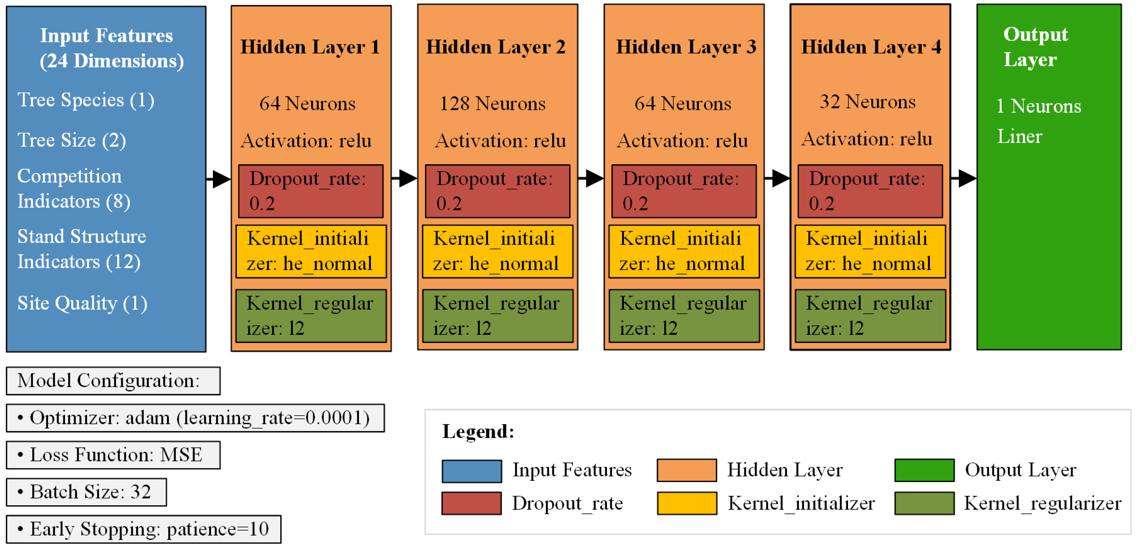 Zhou, L.; Cheng, X.; Liu, S.; He, C.; Peng, W.; Zhang, M. Individual-Tree Crown Width Prediction for Natural Mixed Forests in Northern China Using Deep Neural Network and Height Threshold Method. Forests 2025, 16, 1778. https://doi.org/10.3390/f16121778