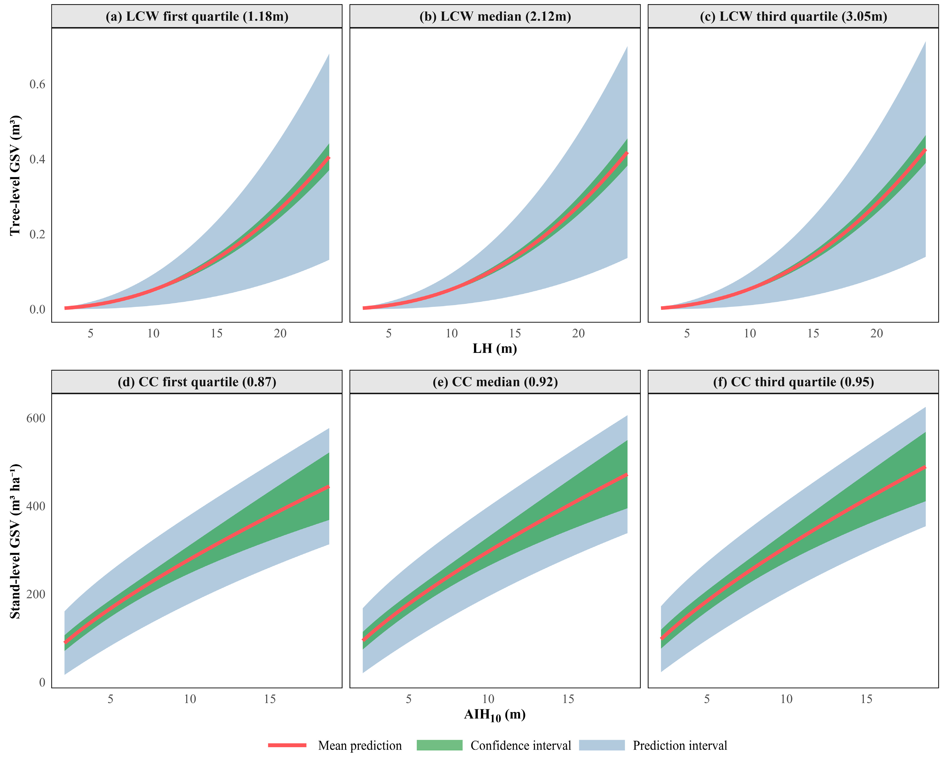 - At the stand level, height metrics were the most critical for accurate GSV prediction. The optimal predictor combination was the 10th cumulative height percentile (AIH10) and canopy cover (CC), exhibiting a nearly linear relationship with GSV. At the tree level, the preferred predictors were LiDAR-derived tree height (LH) and crown width (LCW), with LH accounting for the majority of the variation in GSV.