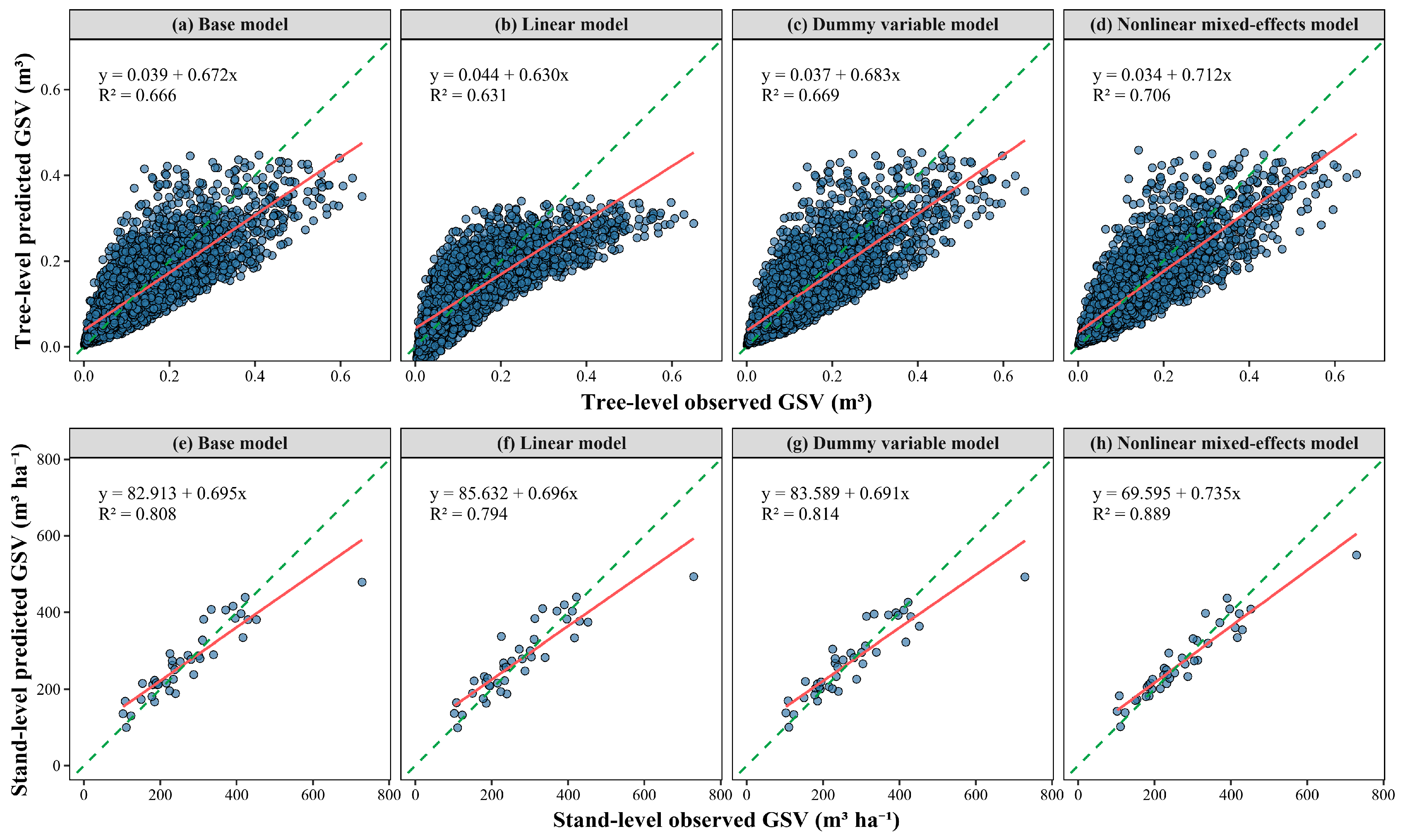 - Regardless of scale (tree or stand level), the base models demonstrated superior fit and prediction accuracy compared to the linear models. The dummy variable models provided only a marginal improvement over the base models. The nonlinear mixed-effects models significantly outperformed the base models. While tree-level models exhibited larger errors for individual tree estimates, they yielded smaller errors for population-level estimates. Stand-level model prediction errors remained within acceptable limits. Consequently, both approaches are suitable for areal forest resource monitoring.